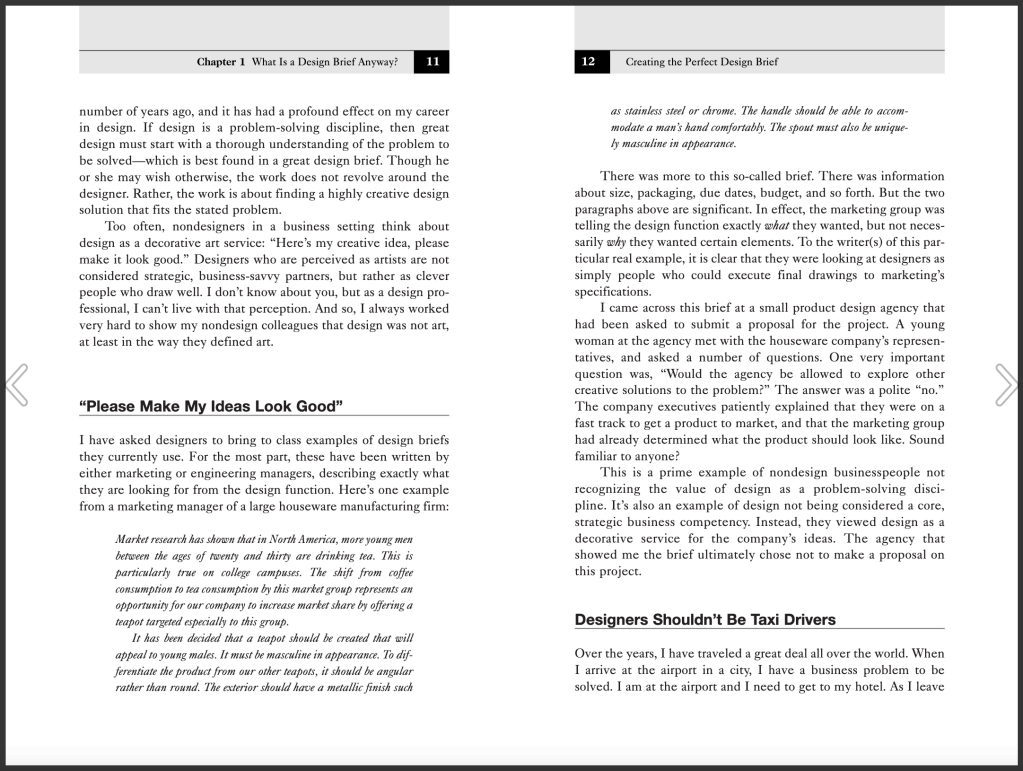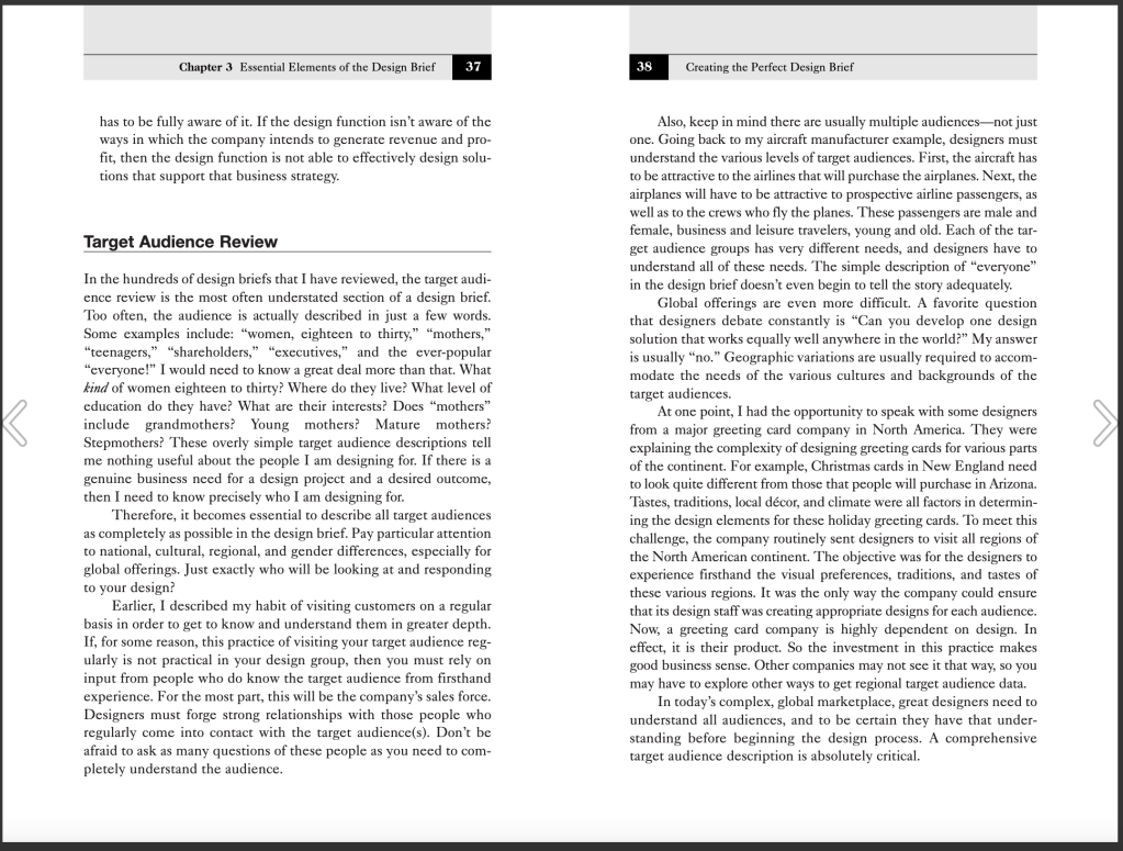 When I create my project brief, I need to refine my audience and make sure I am targeting specific people. Factors like age, gender and what their hobbies or interests might be, and why they are going to be my target audience can help me in the long run with development of my project. If possible, speak to people who relate to your target audience as this will gain insight and fundamental basics for research.“A design brief is written, not verbal” – never make excuses to not have a design brief. Even though this project is only four weeks and a small project, there needs to be a design brief and project plan outlining each week. I also found the paragraph ‘Art versus Design’ really interesting. Although design is visual (especially design that I create as I feel most comfortable with illustration and the visual aesthetics, colour, shape, textures etc.) the principle is that design is problem solving. If it looks good, then yes that is a huge part of design but as long as the issue is addressed and meets its criteria then the visual elements can be a bonus. I could argue however that design is more than problem solving – the visual arty side of design is just as important as meeting the brief. Colours, shape, layout are all subtle nods to subliminal messaging, and could be the difference between making the consumer ignore it, or look twice. I also appreciate that from a clients perspective they should not see design as an arty service, it should be the solution to a problem they have but in a creative way. The difficulty is how we explain as designers what that difference is – if we tells clients to think of us not as creatives but as problem solvers, they may question why we have designers as our title and not problem solvers? I’m not sure.