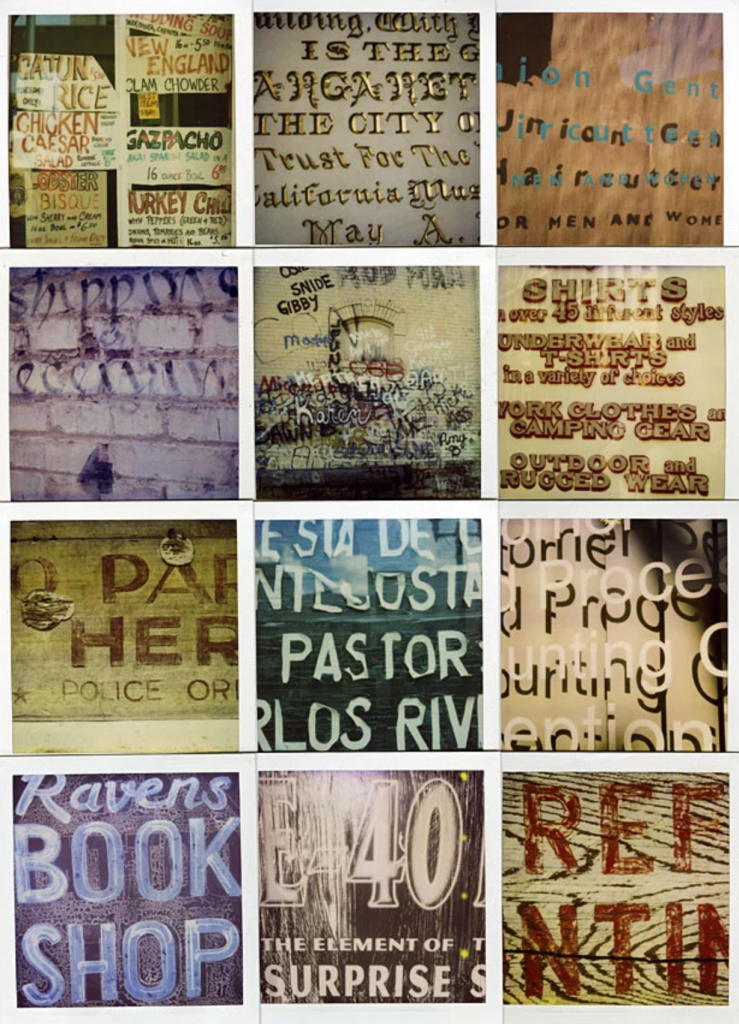 Fella is carefully looking at the bits that we would normally subconsciously erase – the irregular spacing, the unplanned juxtaposition of surface, the weathered image that sits next to an incongruous character. He finds and cherishes the events that make each sign unique, appreciating them not for what they say or for their historical significance, or for any programmed reason, but instead appreciating them for the thing he can use. That is all there is: ideas you might want to re-shape, recycle, reformat, or even occasionally revolt against.