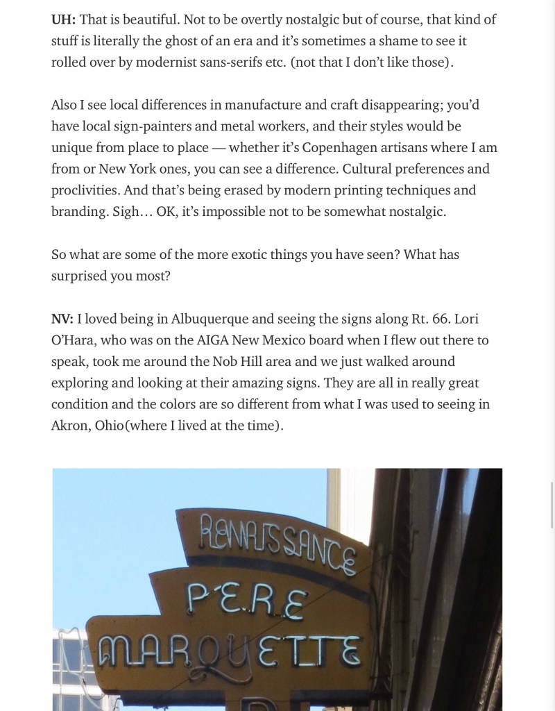 The image 1 paragraph about local differences in manufacture and craft disappearing is something I feel on the border with! I think it depends on a) where you look, and b) where you are. Craft is always going to be here and around in some shape or form, but in a different way. Whether that be manmade with technology or printing it is still a craft. I suppose our shift in society is how we perceive craft today. Just because technology exists does not mean craft is being lost; someone will have been behind the idea, the creation and the output. Even if lettering is made digitally someone has likely drawn and designed that by hand. Maybe Hogrebe means that there seems to be mass production and less one off pieces? I can understand this; with global networks so readily available to access it is inevitable that cultures will mix and designs will be mimicked throughout the world.