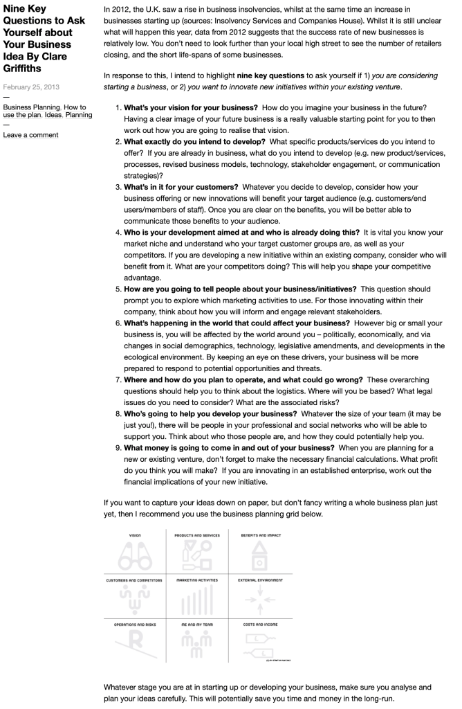 My StartUp Plan – the article posing the nine key questions to ask yourself about your business:
