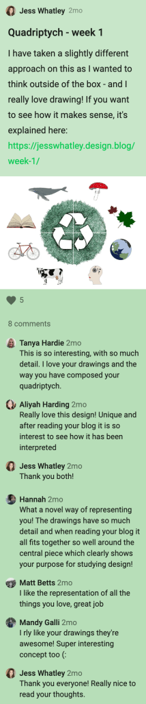 I really valued my peers feedback when it came to my final quadriptych – my illustrative approach was a great contrast to their work and I noticed everyone did their own style – for example, Mandy did photography and Winnie did technology design. There was a lot I could take from everyone’s outcomes this week and it’s encouraged me to think a little outside the box from illustration going forward.
