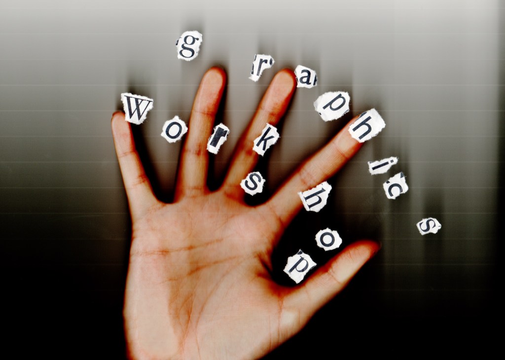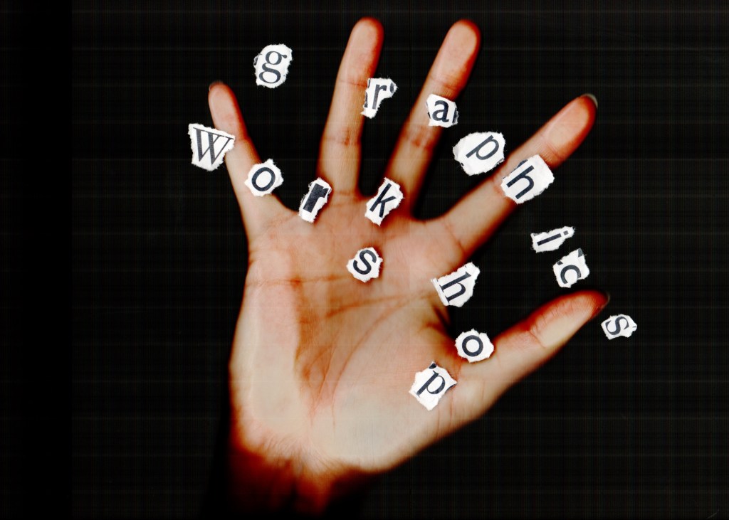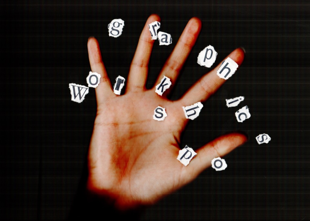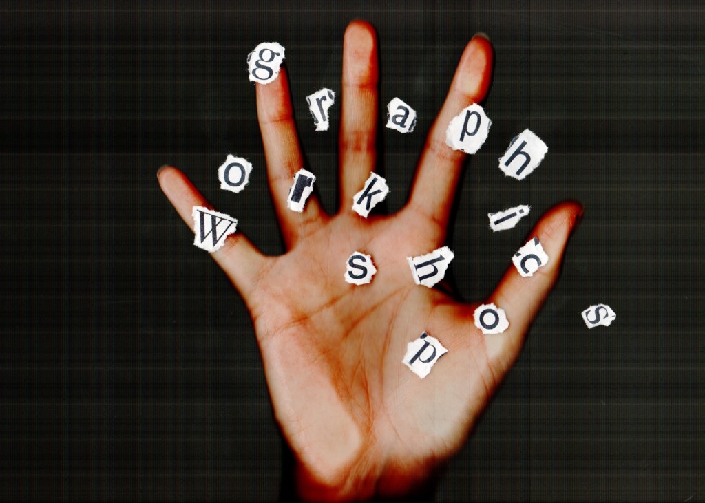 As per my feedback I revisited the scan with the ripped out lettering and printed out letters that are in the brochure itself, which I ripped out by hand and then placed on the scanner with my hand overlaid on the top. The creative message is strong in this cover as the hand is essentially a tool in this workshop; designers will be encouraged in all activities to leave their computer mouses behind and use their hands to hold stationery, paper and this brochure:
