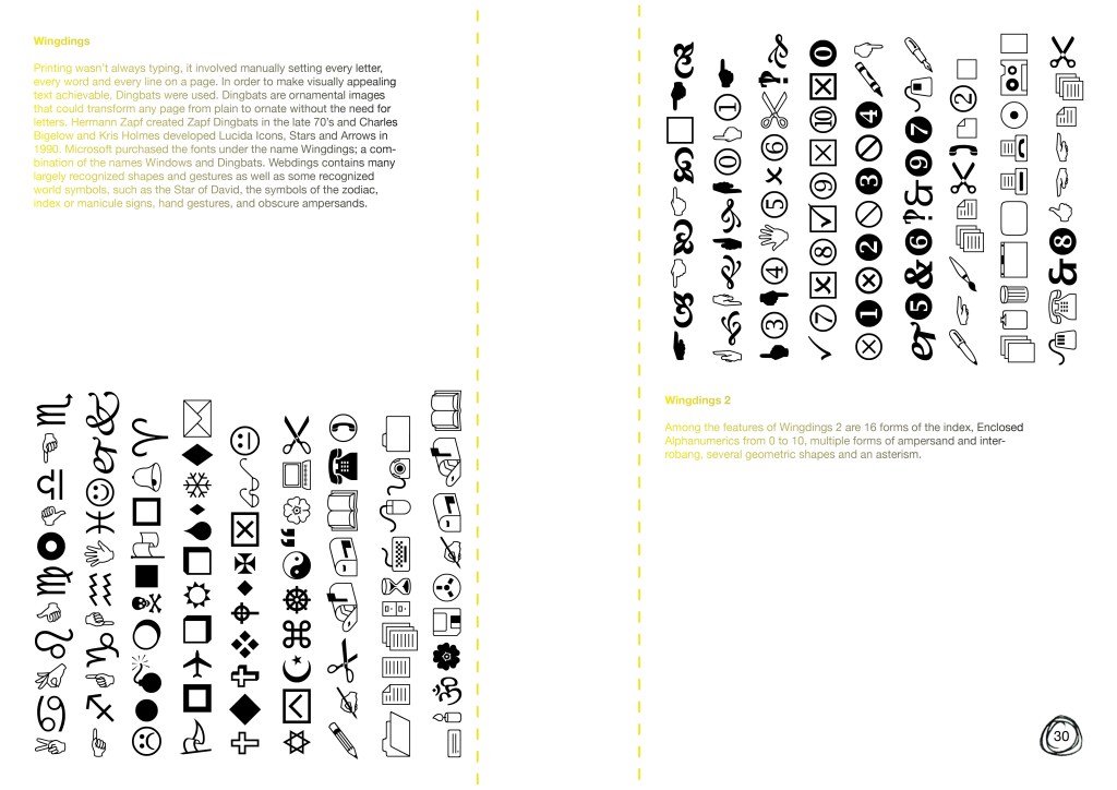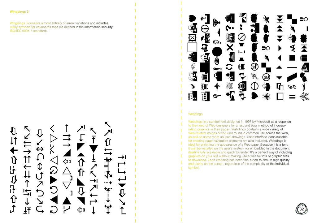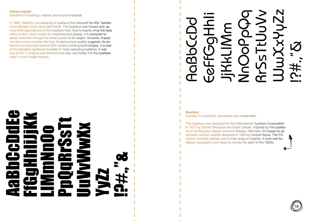I tried putting in the highlighted pieces above into the design but I didn’t think it was successful due to looking really out of place with blank ink and the colour theme; I also thought it got confusing with activity 3 which is yellow themed. I have also added in the specific typeface information in the activities tear-out pages; this is to educate the designers attending the workshop on who made some of the most popular typefaces and what format they’re best used in i.e. headers or body. (I also learnt about them myself (on the next page) which was really beneficial!):