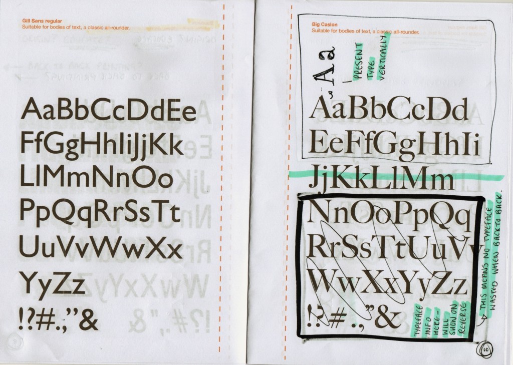 • Tear-out pages are much more appropriate for their functionality. Having the text arranged in this way means the designers in the workshop will only cut into the ‘information’ about the typeface rather than another set. It’s also much more eco-friendly arranging them this way as utilises most of the space on 1 back to back page