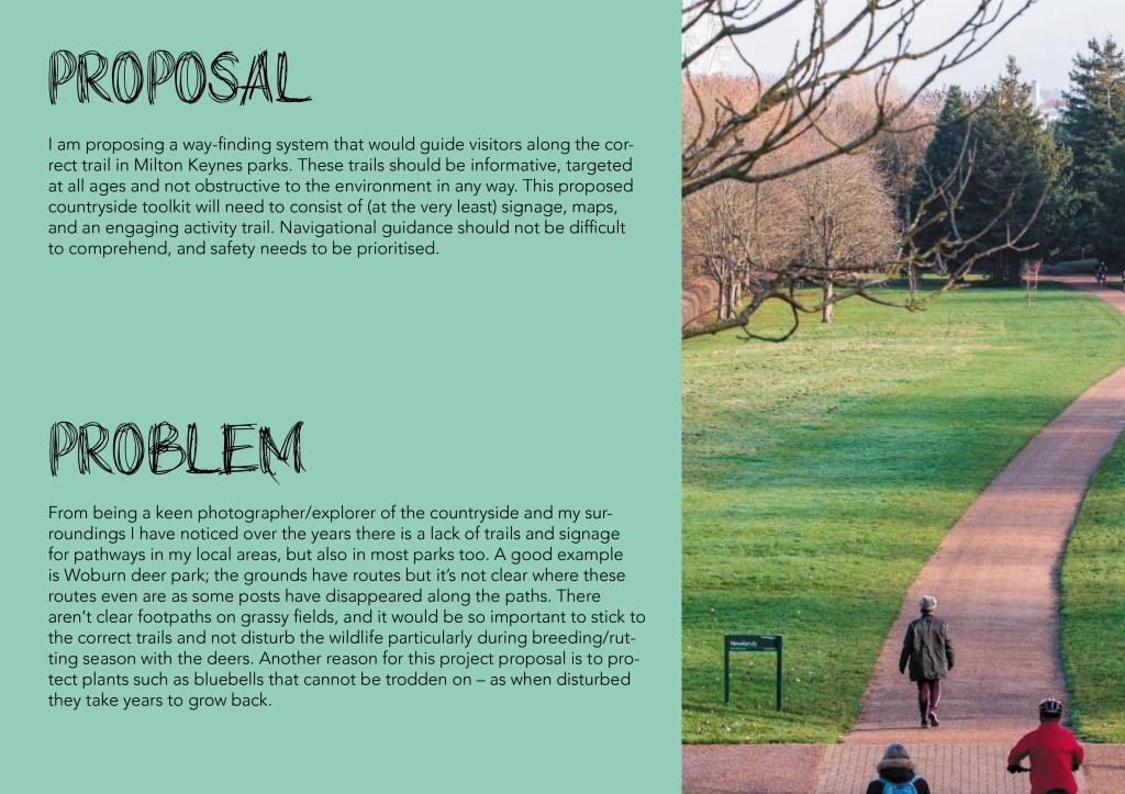 - Poor signage for nature trails – From being a keen photographer/explorer of the countryside and my surroundings I have noticed there is a lack of trails and signage for pathways. For instance, in Woburn deer park there are routes but it’s not clear where these routes even are. There aren’t clear footpaths on grassy fields, and it would be so important to stick to the correct trails and not disturb the wildlife particularly during breeding/rutting season with the deers. I could create a way-finding system that would inform and guide visitors/explorers along the correct trails.
