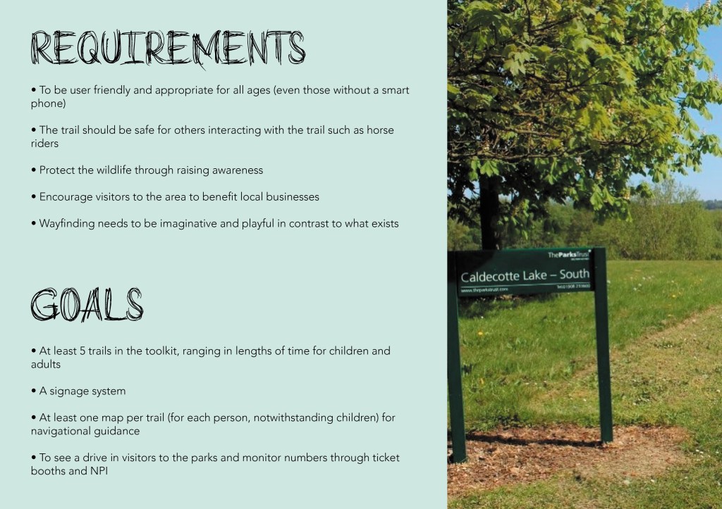 I am proposing a way-finding system that would inform and guide visitors/explorers along the correct trails. These trails should be informative, targeted at all ages and not obstructive to the environment in any way. This proposed countryside toolkit will need to consist of (at the very least) signage, maps, and an engaging activity trail. Navigational guidance should not be difficult to comprehend, and safety needs to be prioritised.”