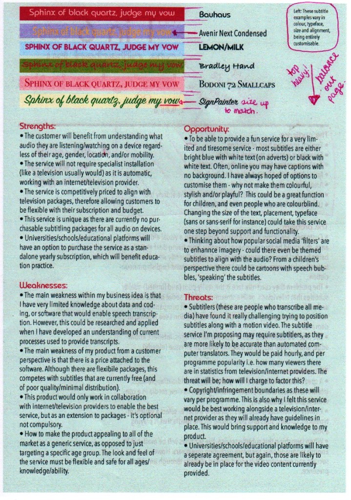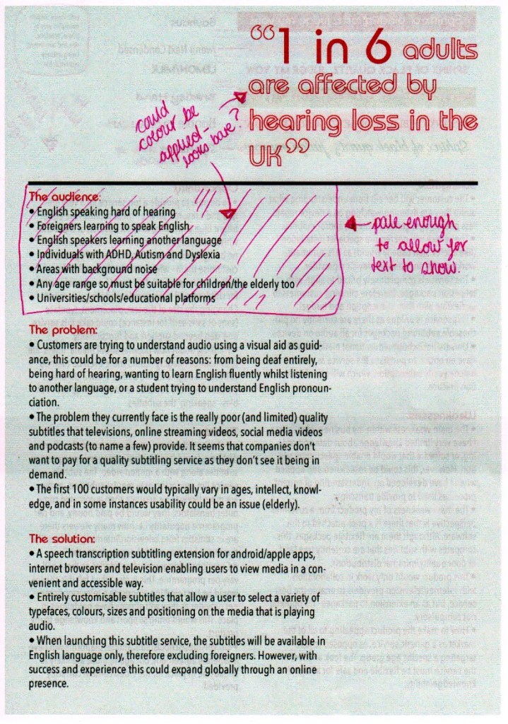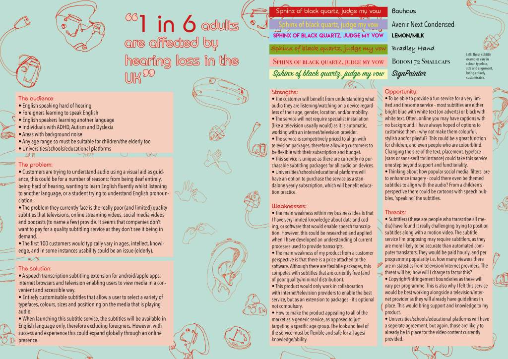 The branding is colourful as I felt it should represent what the service would enable my customer to do. I have chosen red and pale green – as I am interested in colour theory I looked into this and red is often associated with importance, courage and power, whilst green is known in the medical world as being a healing colour. I thought these colours contrast well not just in appearance but in meaning – one is energising (red) whilst the other is calming (green). I definitely see my service as important and therefore catching a viewers attention, but at the same time bringing a peace of mind to someone who has difficulty understanding audio.
