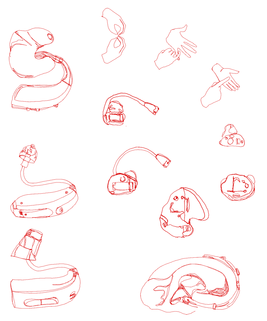 Using photographs of hearing aids as a reference (my own included) portrays my subject matter. I have used illustrations of sign language for two reasons – a) some of my target audience would involve people who are deaf and use sign language to communicate, and b) I was taught the sign language alphabet in primary school and it stayed with me, and I always wanted to learn more. So this year I took sign classes and learnt how to sign sentences and basic communication like time, weather, mood: