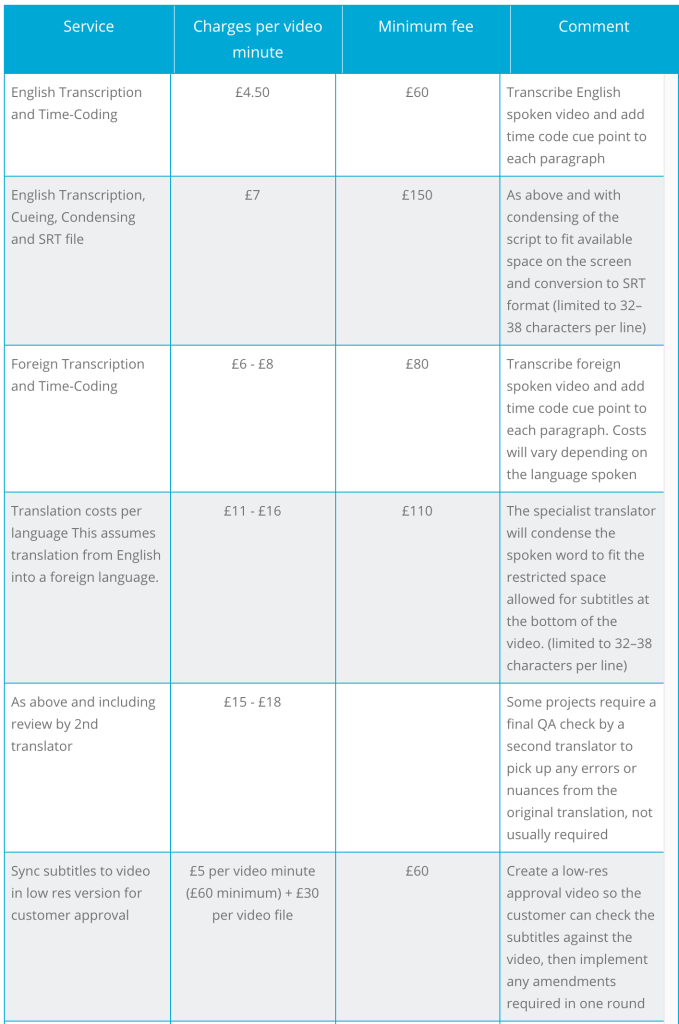 Subtitling services such as Matinee charge by amount of time that needs to be translated – they also charge per document, by the amount of people reviewing the subs and whether there is one language or more. This is food for thought with my concept – as I would want to offer different packages I could use some differentiators like Manitee have done, to determine what a customer will get for their money.