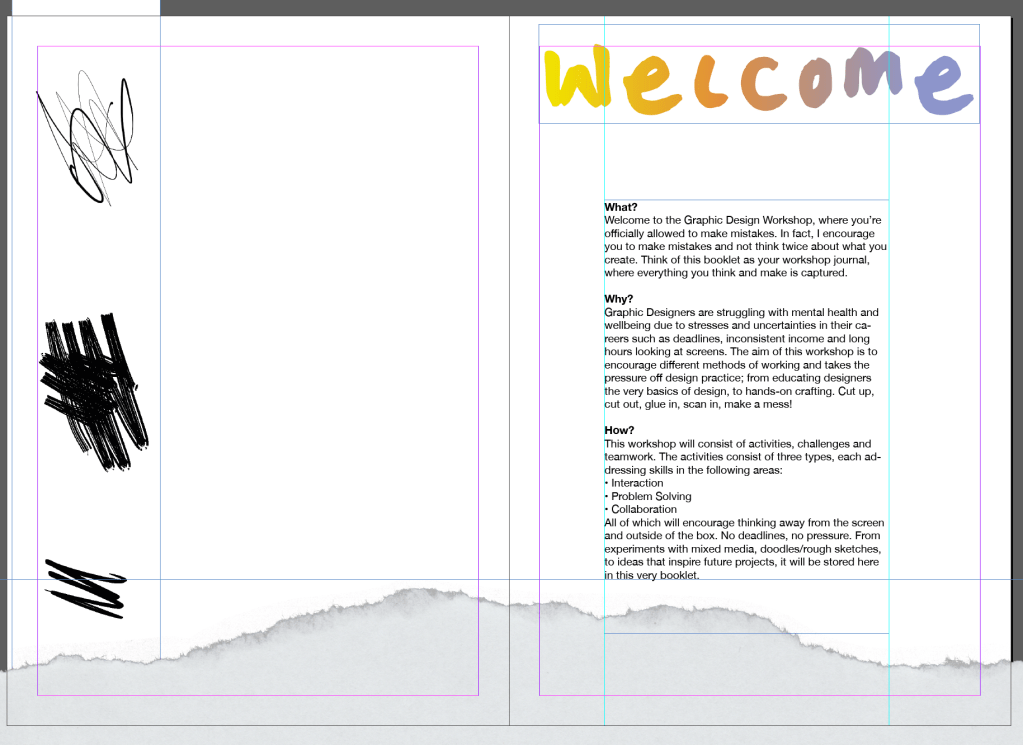 Going back to when I set out my project plan, I just want to make sure I have followed what I set out to create. I feel the best addition to this booklet would be a Welcome page to introduce to the designers in the workshop, what, why and how they will be participating: