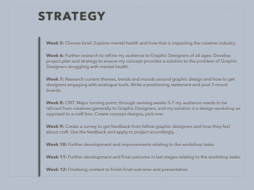 I’m have gone back to look at week 6’s project plan for this, to make sure I am providing the right information to my designers: