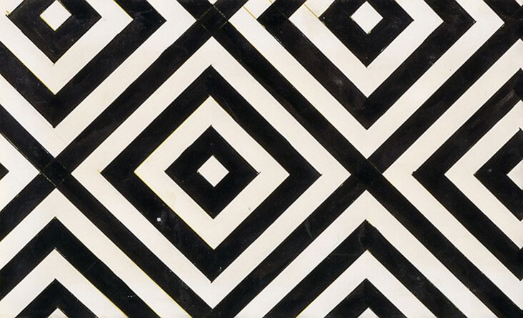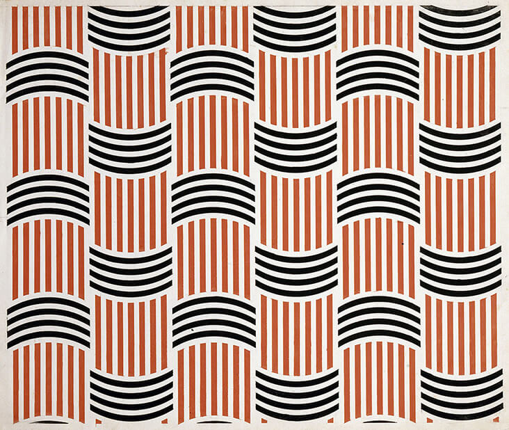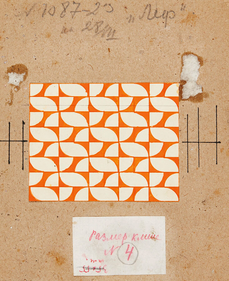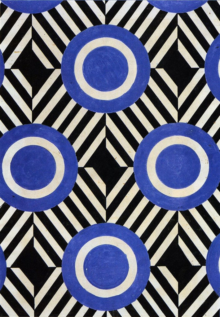 “Economic in style, her stylised designs echoed the refined geometry and ‘spatial force constructions,’ in her earlier paintings, but with a greater emphasis on flat forms, pared back colours and dazzling, eye-catching motifs. All designs were made by hand using stencils and rulers, prioritising a machine-made aesthetic. Popova particularly favoured orthogonal forms with a balanced, clear structure, including stripes, right angles and dazzling zig-zagged straight lines to create dynamism and energy, which were sometimes intersected with circles and triangles. The inclusion of black and white elements created even more drama and visual impact.” – Source