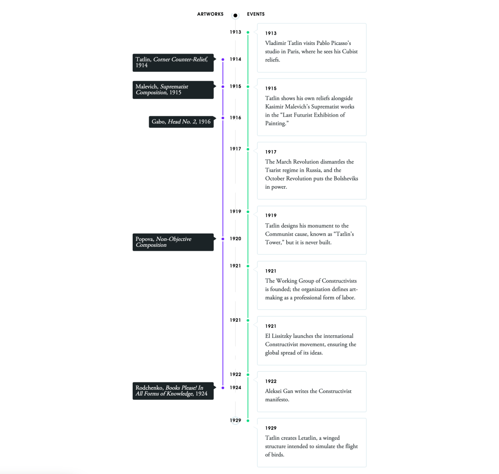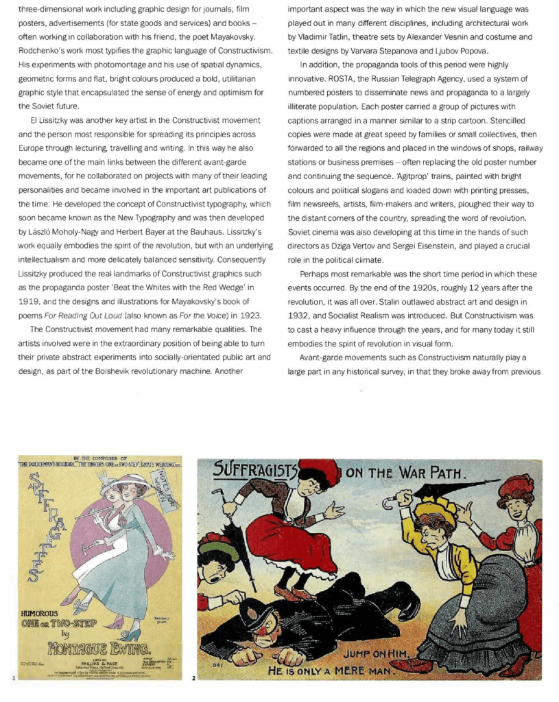 “The movement emphasized building and science, rather than artistic expression, and its goals went far beyond the realm of art. The Constructivists sought to influence architecture, design, fashion, and all mass-produced objects. In place of painterly concerns with composition, Constructivists were interested in construction. Rather than emerging from an expressive impulse or an academic tradition, art was to be built.A new, Constructivist art would look toward industrial production; approach the artist as an engineer, rather than an easel painter; and serve the proletariat. Constructivists used sparse, geometric forms and modest materials. From paintings to posters to textiles, they created a visual language out of forms that can be drawn with utilitarian instruments like compasses and rulers. They placed visual culture under the microscope, analyzing materials like wood, glass, and metal, to judge them for their value and fitness for use in mass-produced images and objects.” – Source