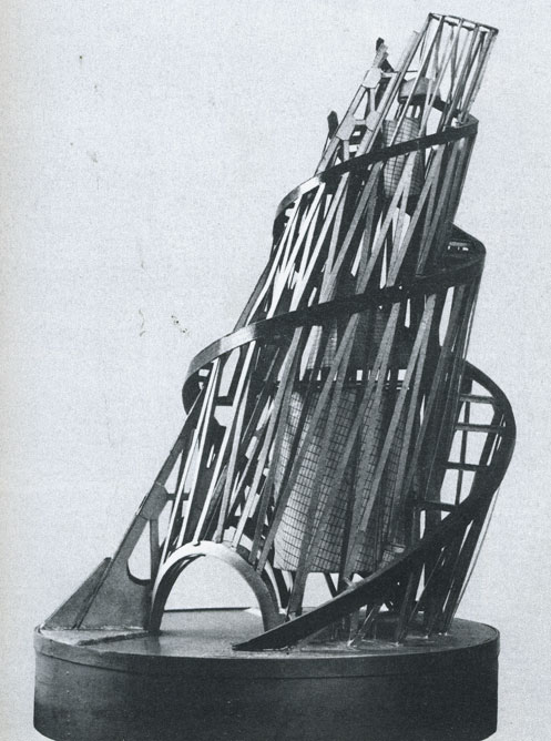 “The optimism Tatlin felt manifested most famously in his proposition for a massive tower called the Monument to the Third International. The name was a reference to the Communist International, a group that advocated for global communism. The tower was designed to be one-third taller than the Eiffel Tower, making it the tallest building in the world at the time. It would also be made of the most modern material, such as iron, steel and glass, and, being simultaneously practical and abstract, would represent the epitome of constructivist ideals.” – Source