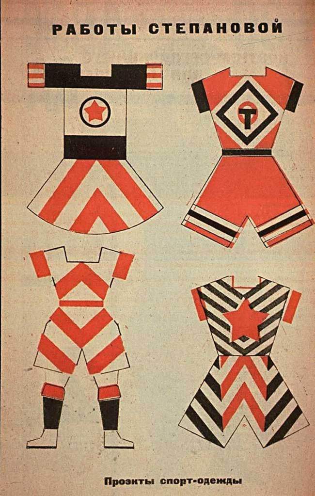 “The workers of the new world would live and play in the very best materials and designs: casual jumpsuits and overalls that drew on both traditional peasant clothing and the latest modernist artistic trends of futurism and cubism. Stepanova’s designs use dynamic shapes that emphasise the human body in action, with sharp angular forms, printed abstract patterns and contrasting colours: bold reds and blacks. Her clothes would enhance the flexibility and comfort of moving through the streets and the city, in the factory and on to the playing field, while unisex clothing patterns would no longer confine men and women to stifling gender norms.” Source
