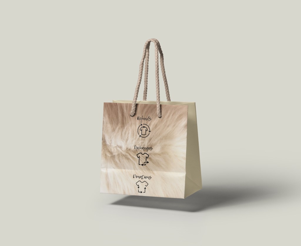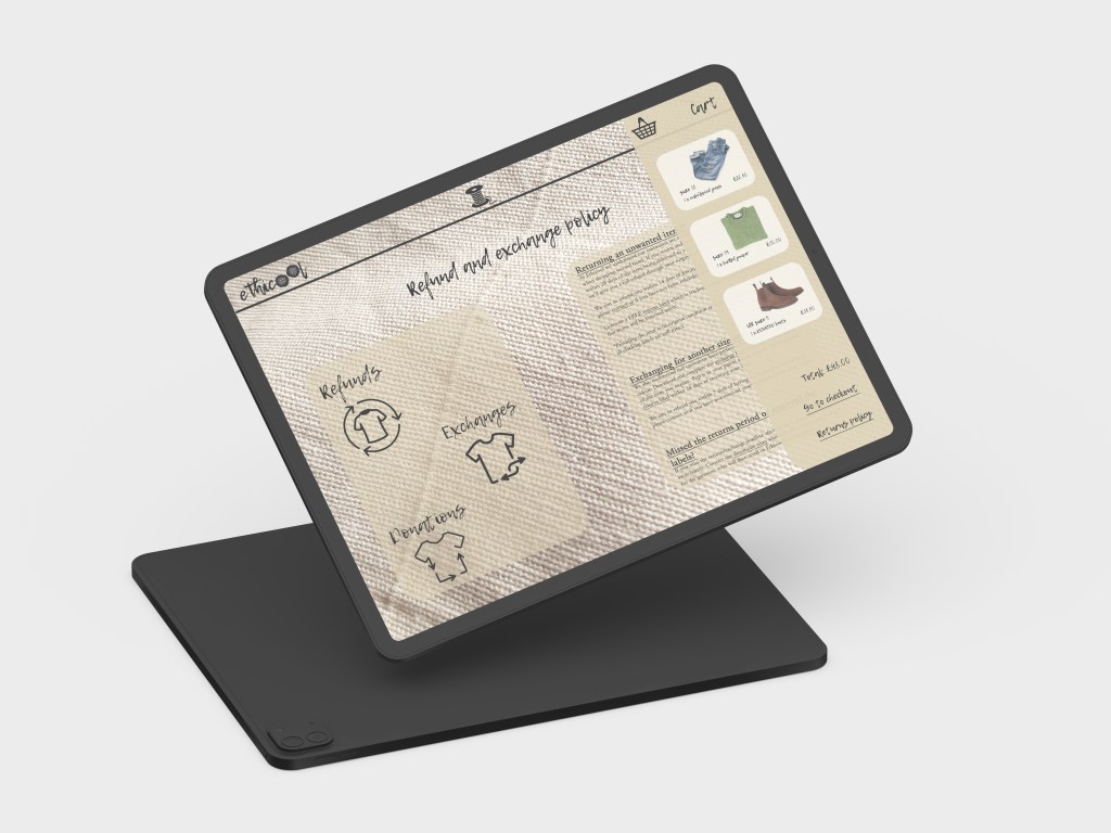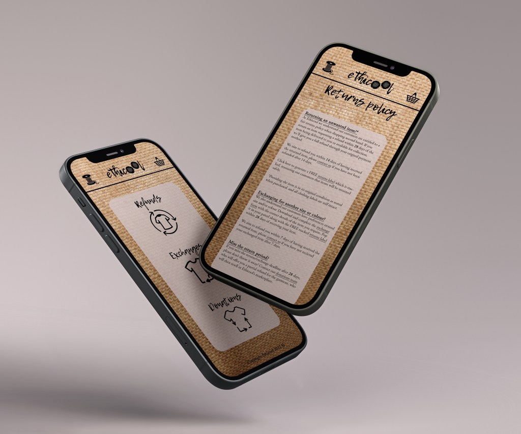 As I know Ingrid’s brief only wanted an easier online shopping experience, I have created those mockups of the website and ensured I prioritised the returns policy and communicated this as much as I could. However there are further ways I want to push this as I think this brief has a lot of fun potential. One of these introducing a second hand physical store, with a textiles workshop at the back, and using packaging to promote the store in-store and online.