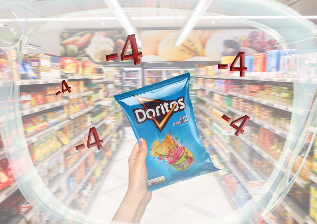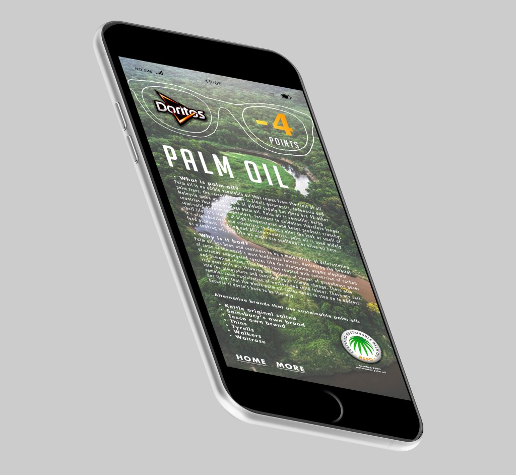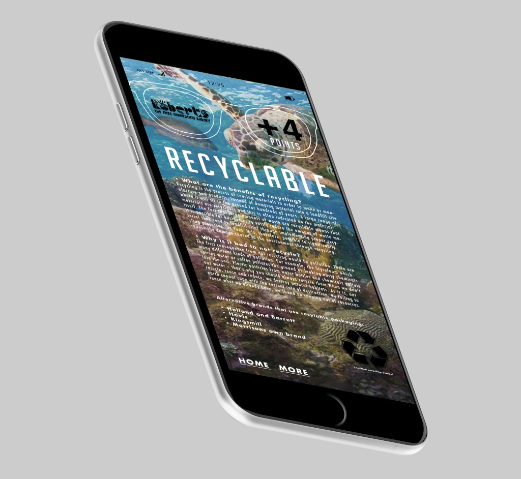 This would be what the shopper sees when wearing the VR glasses shopping for their groceries. I wanted to make it fun for the shopper, and plus points always seem exciting. It’s a motivational/educational concept that will increase buyer awareness of products; or at the very least expose brands for their sustainability awareness.
