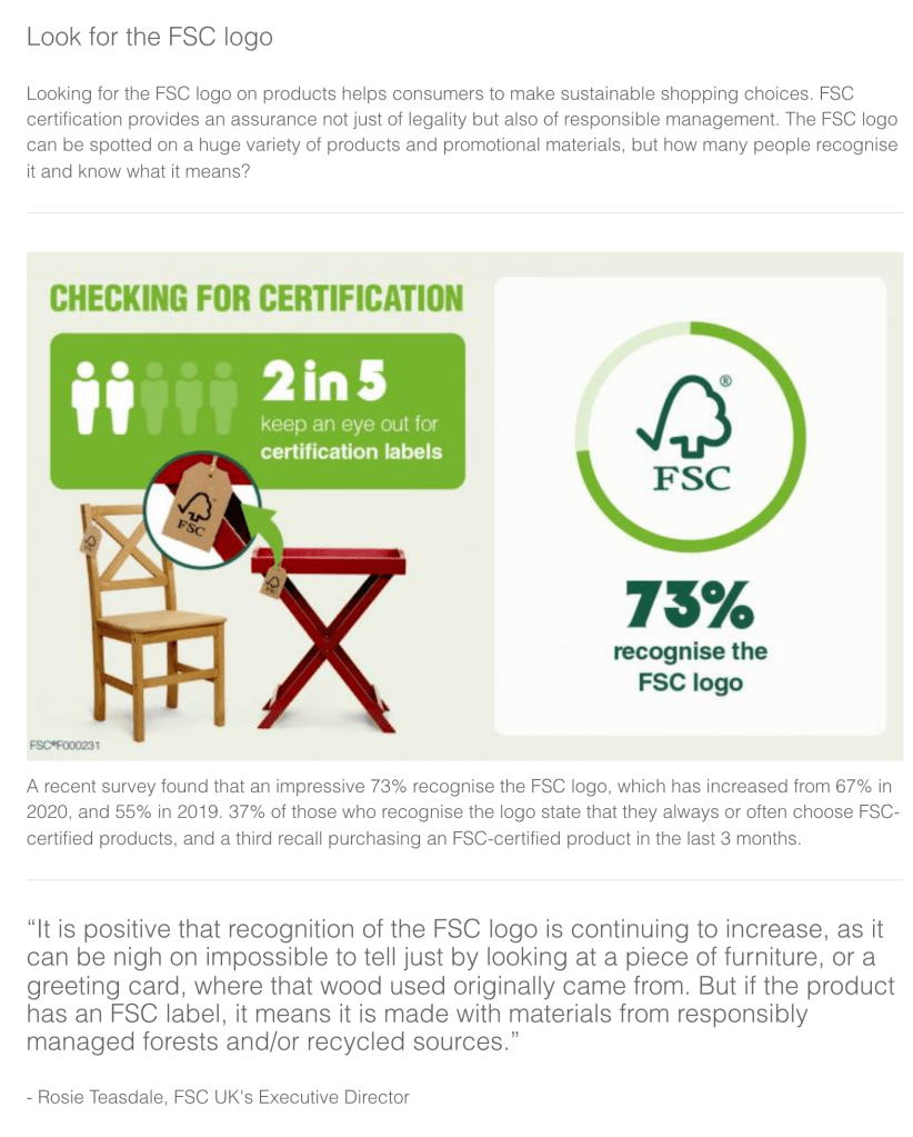 - I need to investigate FSC further as although they are sustainable and a huge advocate for ethical forestation practice, are they doing anything to prevent companies which do not use certified sustainable materials? What are they doing to tackle the big picture?