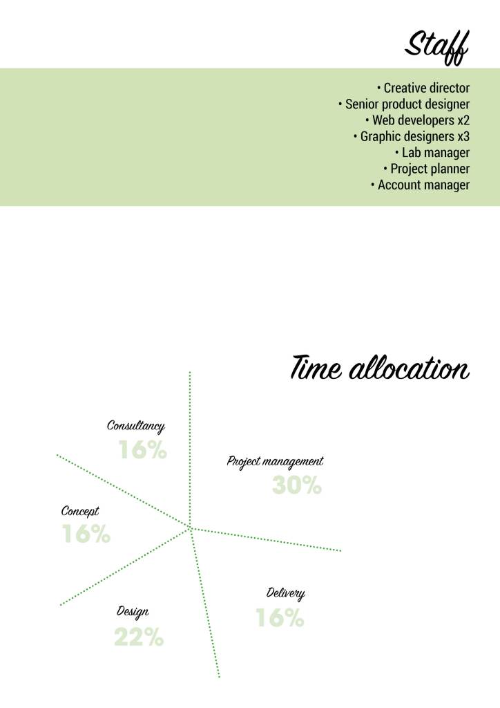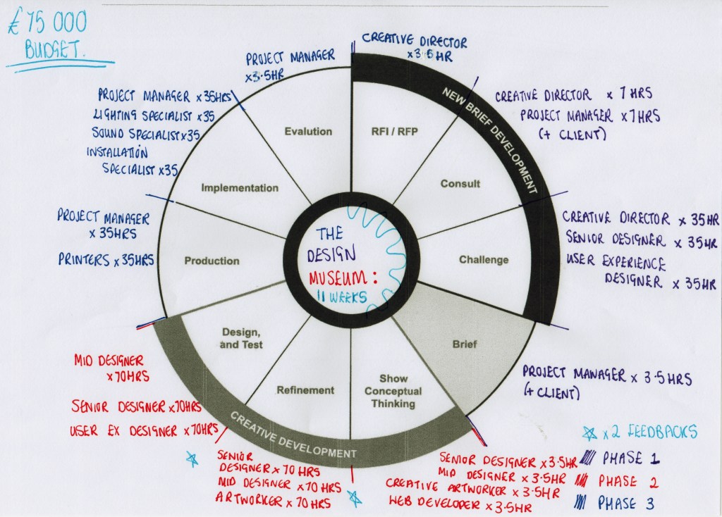 Further development of budget plan as I needed to figure out an example of how I could present the three phases to the client (design museum) and equally plan the time between all of my staff: