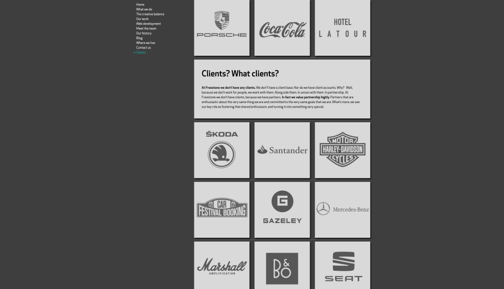 As a graphic design studio, they are presented as prestigious, confident and bold. Founded in 1984, the company was developed by the founder, Stuart Freestone. The name has remained the same since. This suggests that Freestone is a trusted, respectable name, with a history of successful design. The words used to describe themselves on the website include: “reputations”, “referrals”, “balanced” collaboration”, “insight”, “strategy” – all qualities of a successful, experienced company.