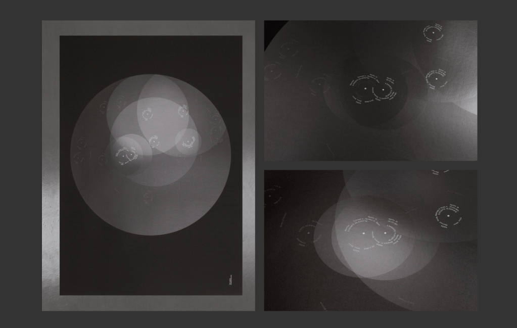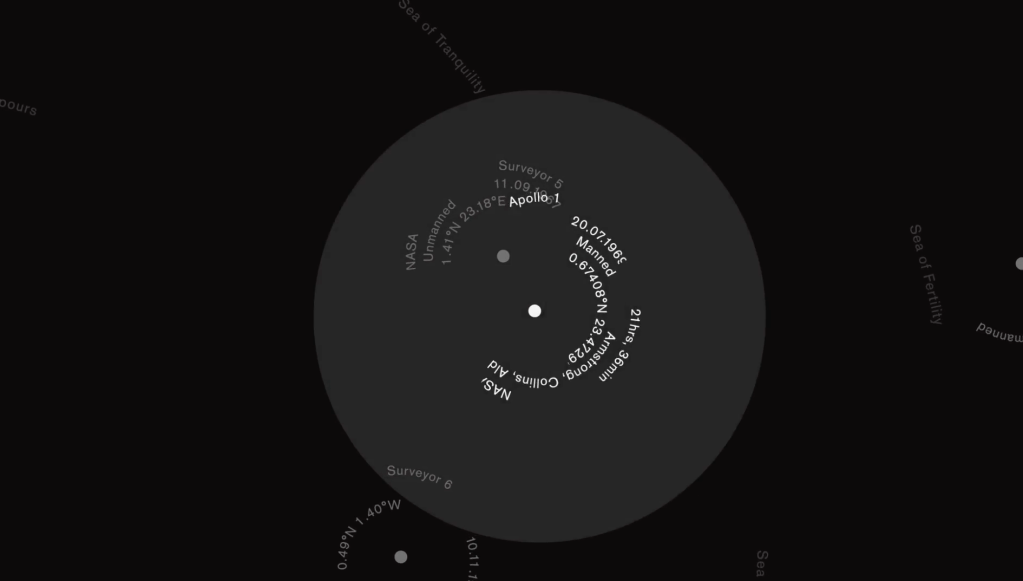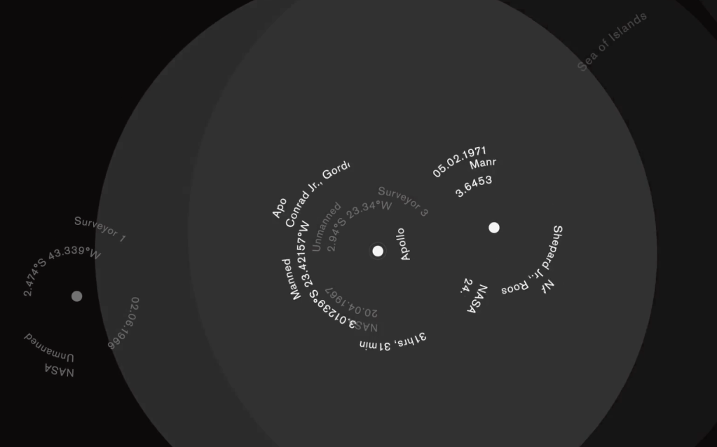Overlapping discs depict the exact landing location of each mission and the amount of time they spent on the lunar surface. The visual language is inspired by the iconic footage of the first human moon landing, with its incredible silver and white tones, dark black shadows and enigmatic moon-dust.”