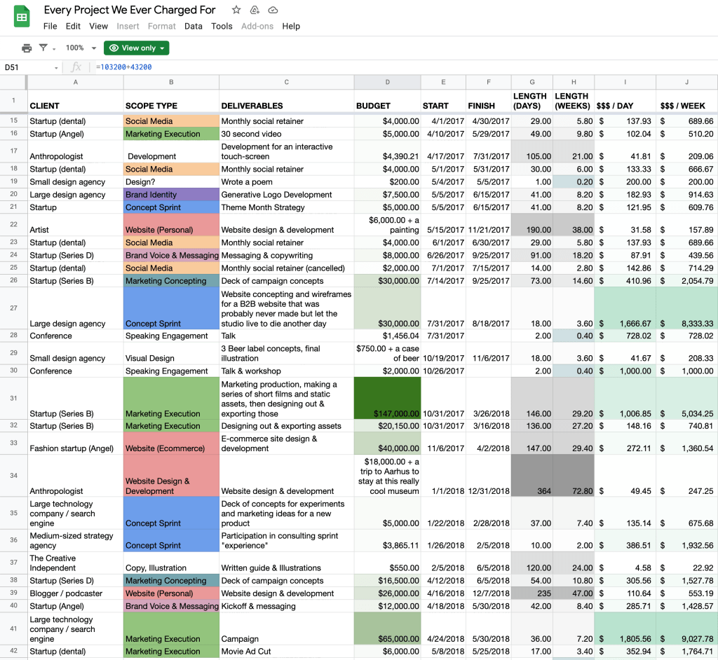“I hope something like this will help to convince you that if I were to come to you as an individual and ask you to design a logo for me and a huge multinational company was to come to you and ask you for exactly the same amount and piece of work, I hope that you’re comfortable charging them a far, far higher fee than you are charging me.”