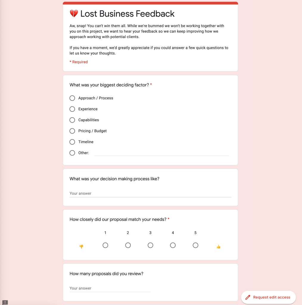 Lost business feedback form: Personally I think this is great and a super way to improve your business with time. People will appreciate that you took the time to ask ‘why’ and maybe you could improve for future – in which case the business who gave you feedback may then become a client:
