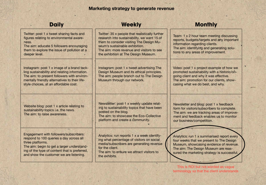 Overall, I believe that there is a well executed business plan being presented to the client – The Design Museum. To look at it from a client perspective, I would want to know the basics behind the execution of the exhibition, such as costings and why my business should consider Eco-Collective for the project. Therefore I have highlighted areas which the collective business will excel over other potential suitors, such as offering a range of marketing services at an additional cost. This allows the client to have a customised experience as they can pick and choose elements in the exhibition journey. As Eco-Collective are an entirely sustainable company I have also included insights into sourcing materials, and how we generate an exhibit that can educate and change the perspective of a consumer.