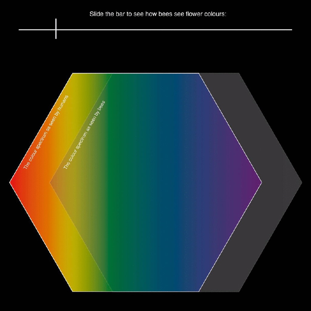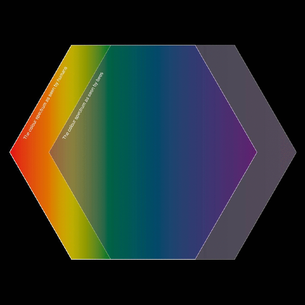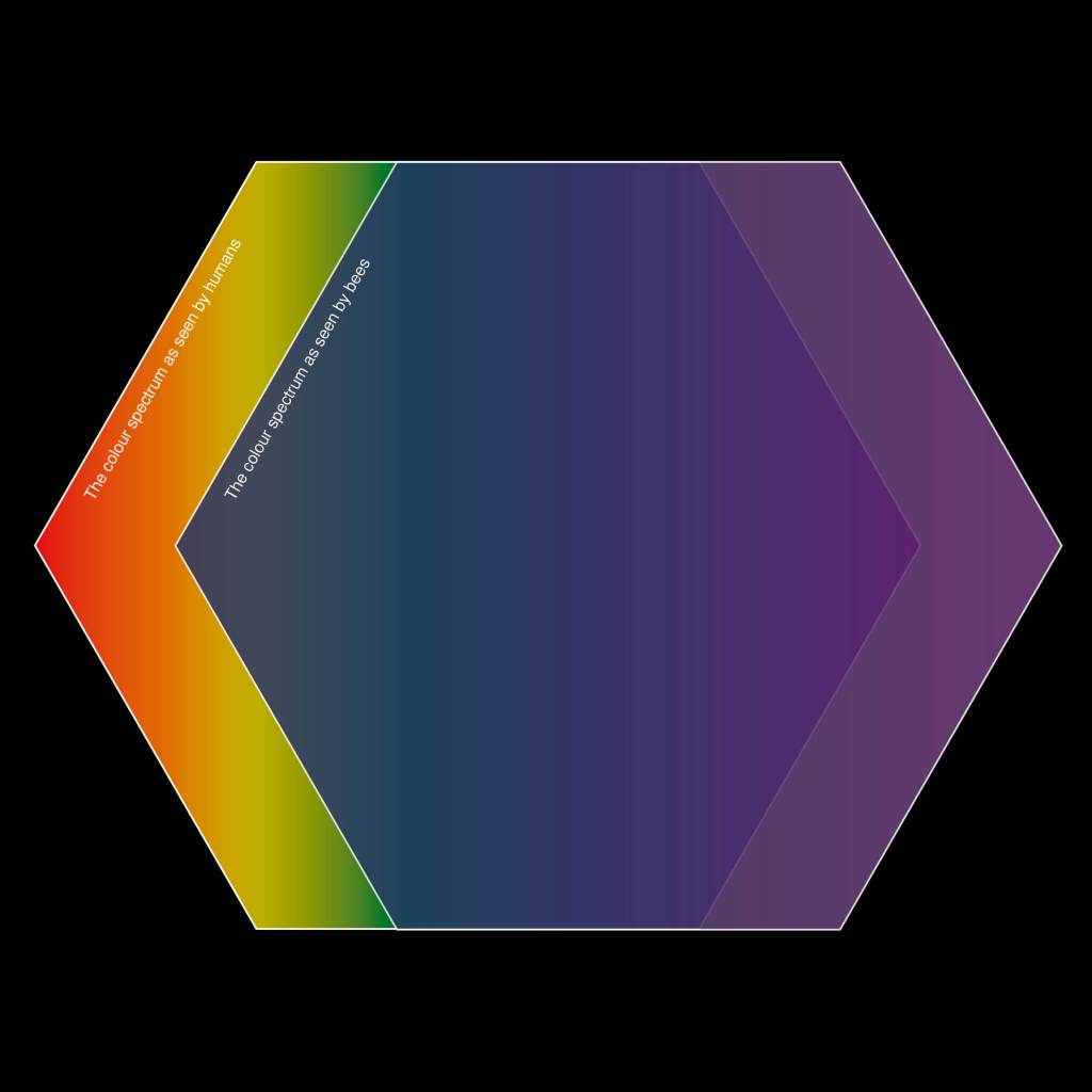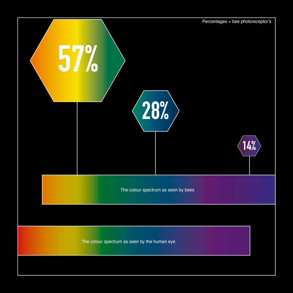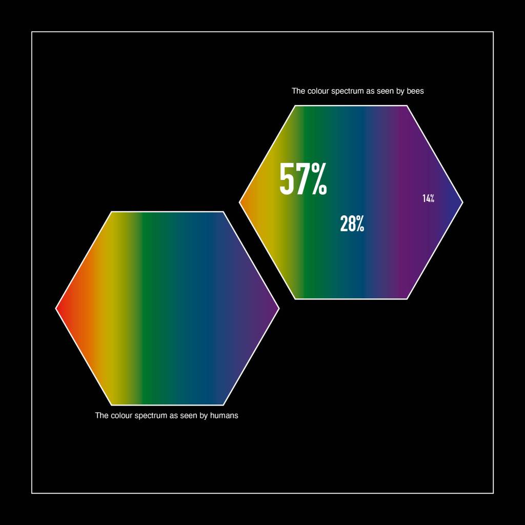 Just like us humans, bees have trichromatic vision, ie they have three different photoreceptors in the retina. These distinguish three certain primary colours, which form the basis for colour combinations seen. The primary colours for humans are red, blue and green and for bees, blue, green and ultraviolet light.“