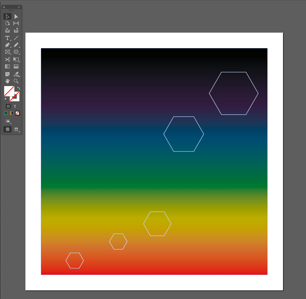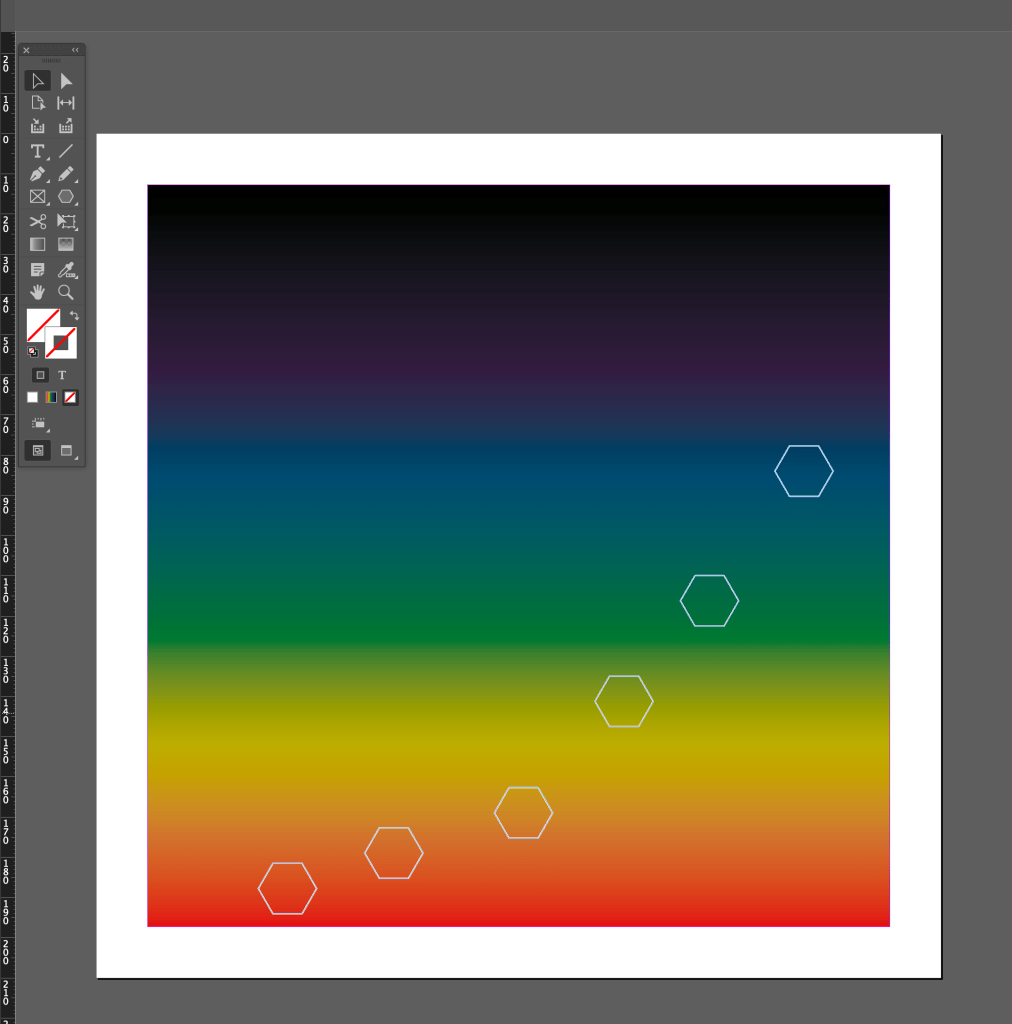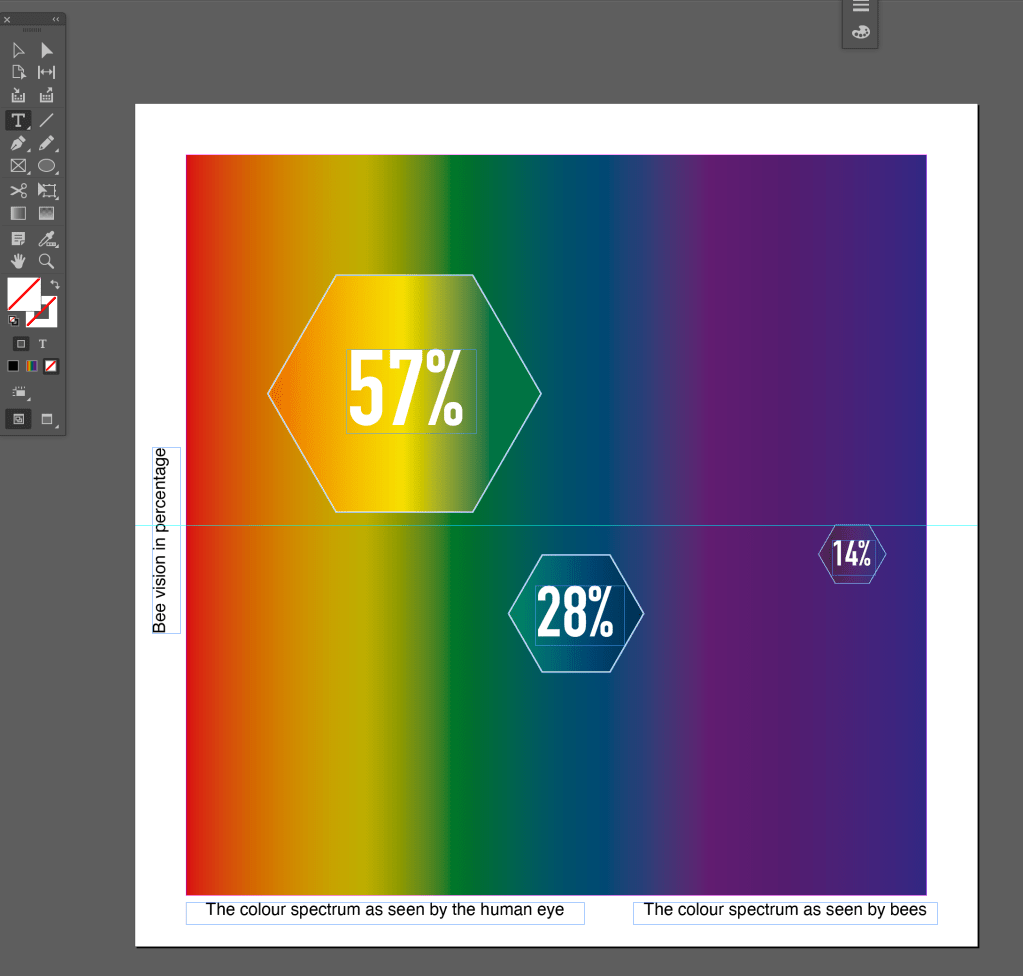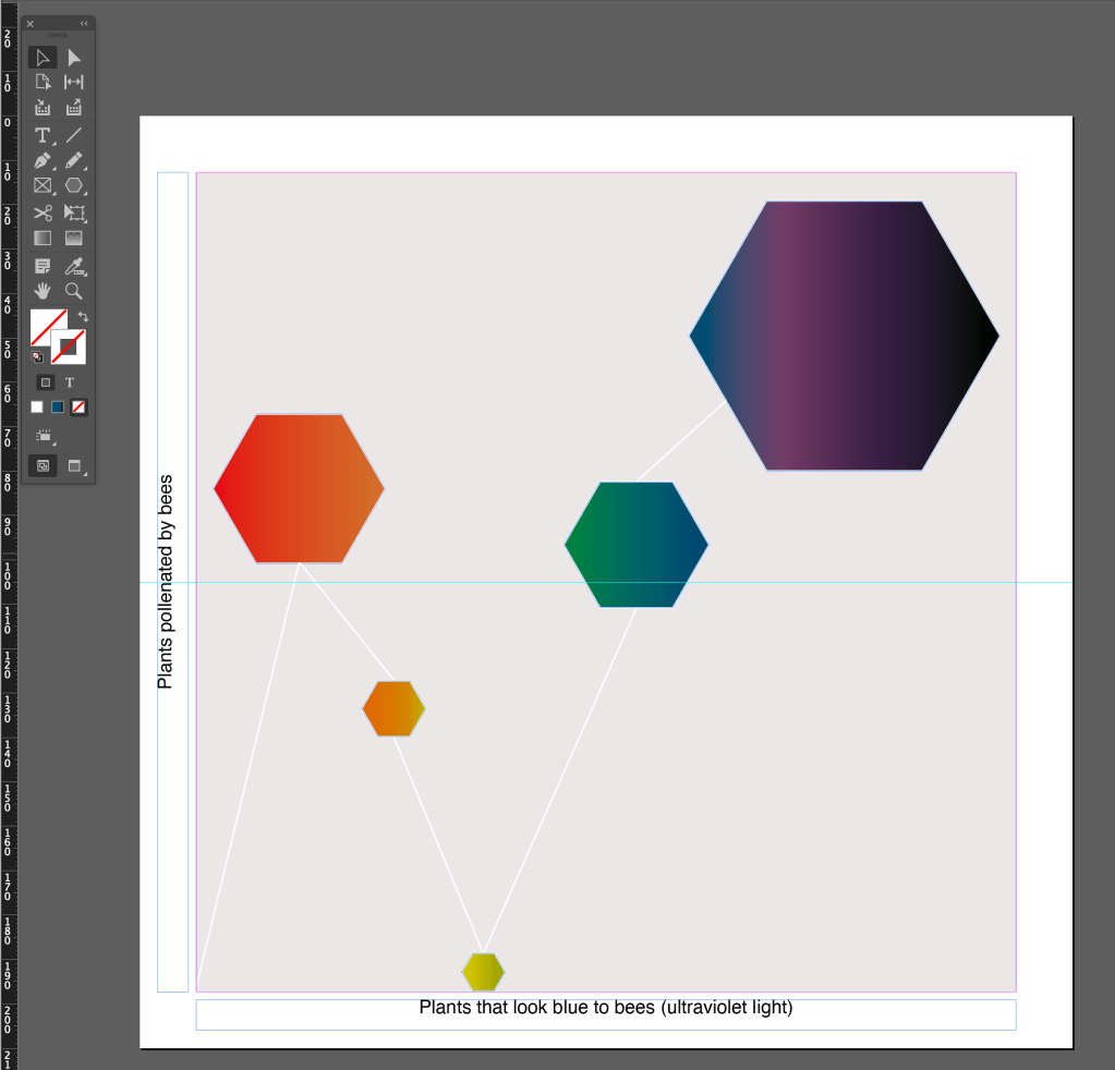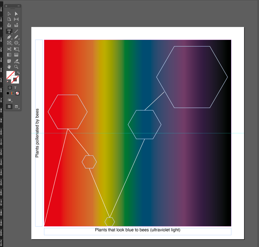 To begin with, I have considered the information I am essentially needing to portray in my data diagram is; the bluer the flower, the more bees that pollenate it. I have begun with hexagons representing the bees (referencing a honeycomb structure) and using the ROYGBIV gradient to represent flower colours in the background: