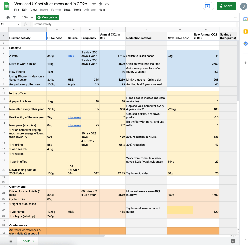 What I particularly love about this idea below, is that it encourages companies to consider their footprint through their daily working outputs. For graphic designers to reduce their footprint and CO2 emissions they first need to measure what is being used. A simple excel grid like below would identify cost, frequency and how to reduce the worst areas: