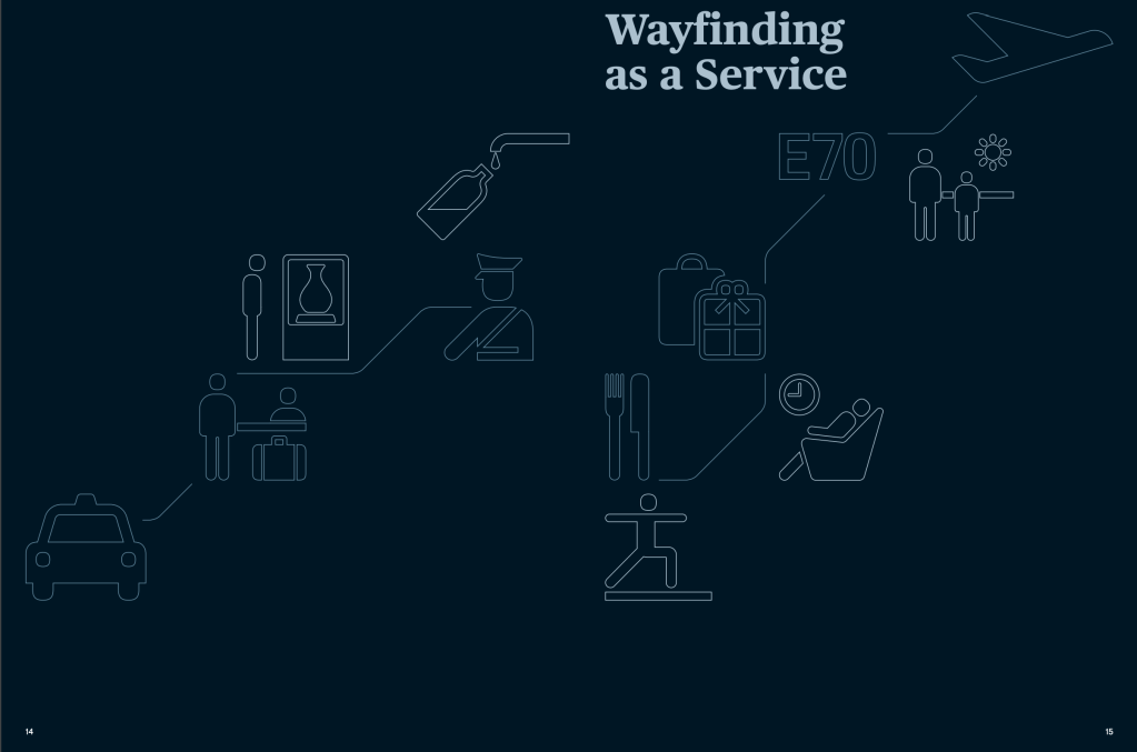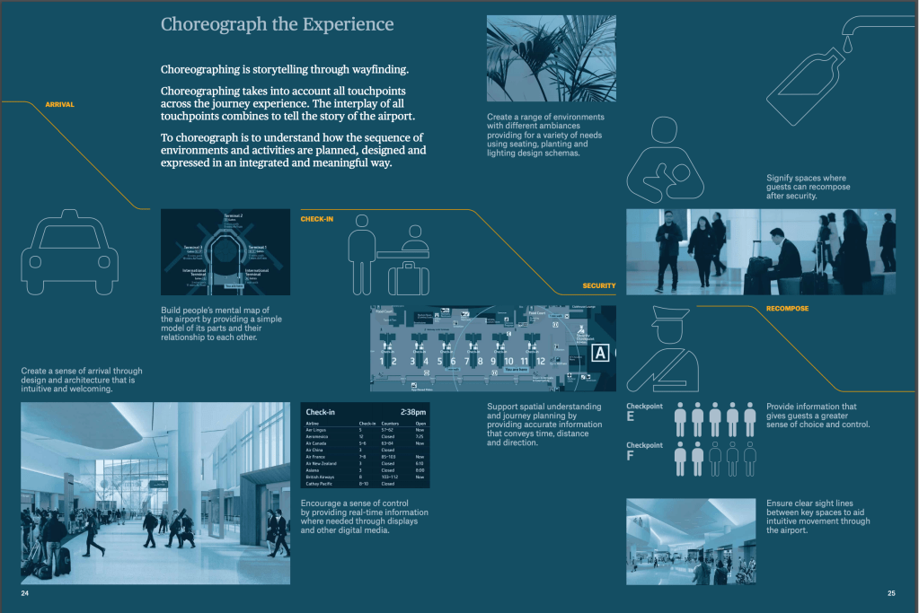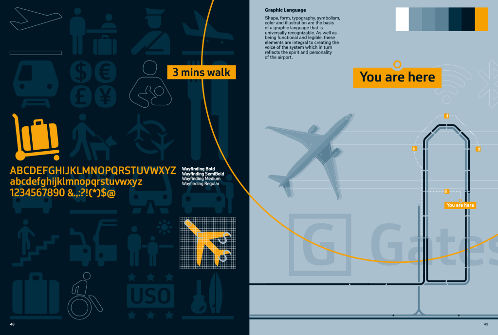 I looked into wayfinding in the last module (for my design museum concept) and Airport – City ID is a really nicely designed wayfinding document that I found on their publications page. I thought it was important to keep it as a reference as the symbols and lines on the page guide the viewer along a journey, but the colour theme is keeping the document sleek and minimal.