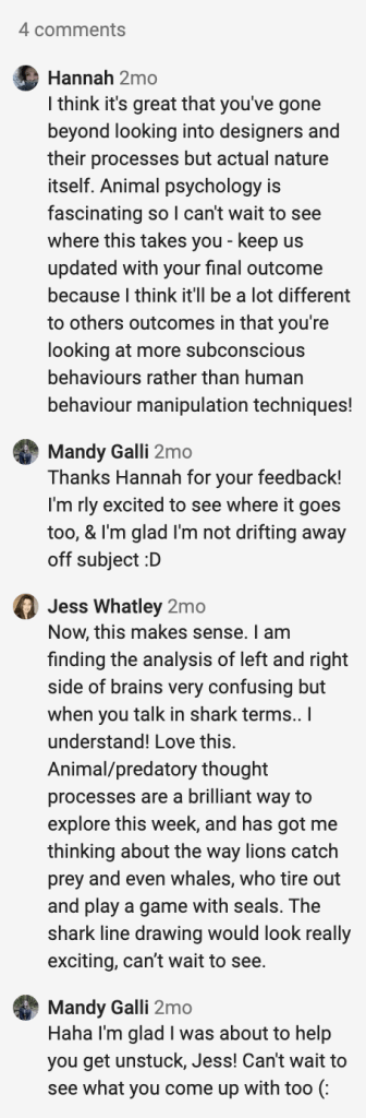 Winnie’s final outcome this week was so effective for the brief. I really liked how Winnie utilised the fact that Java was a new learning experience for her at the time and decided to create an interactive line drawing website with a quote to support her methodology of white space. It’s really inspiring and I would love to learn how to do something like this myself – I didn’t actually know Javascript would do something like this!!