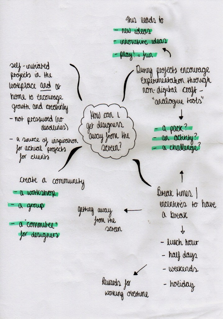WeTransfer campaign (above video) urges creative workers to limit screen time as it can be the complete opposite of inspiring for creatives; I think there is such a thing as absorbing ‘too much’ information especially from online websites, news articles, social media etc. I think spending too much time on the screen is counterproductive – you absorb information you don’t need and that can be overwhelming. There are multiple ways to find research offline which I try to use – books, photos etc. – that inspires me more than online content and is actually relevant on a certain topic you need. It’s also more satisfying to have produced something whilst in the process of making something bigger. This is the feeling I want designers to achieve when using my project outcome.
