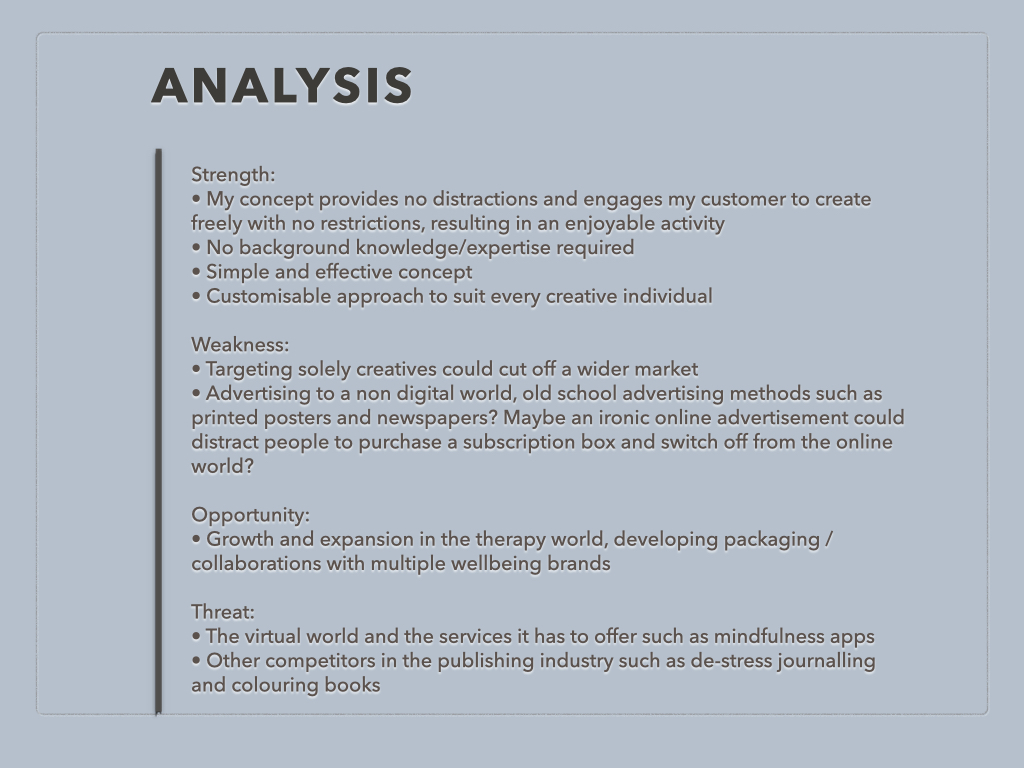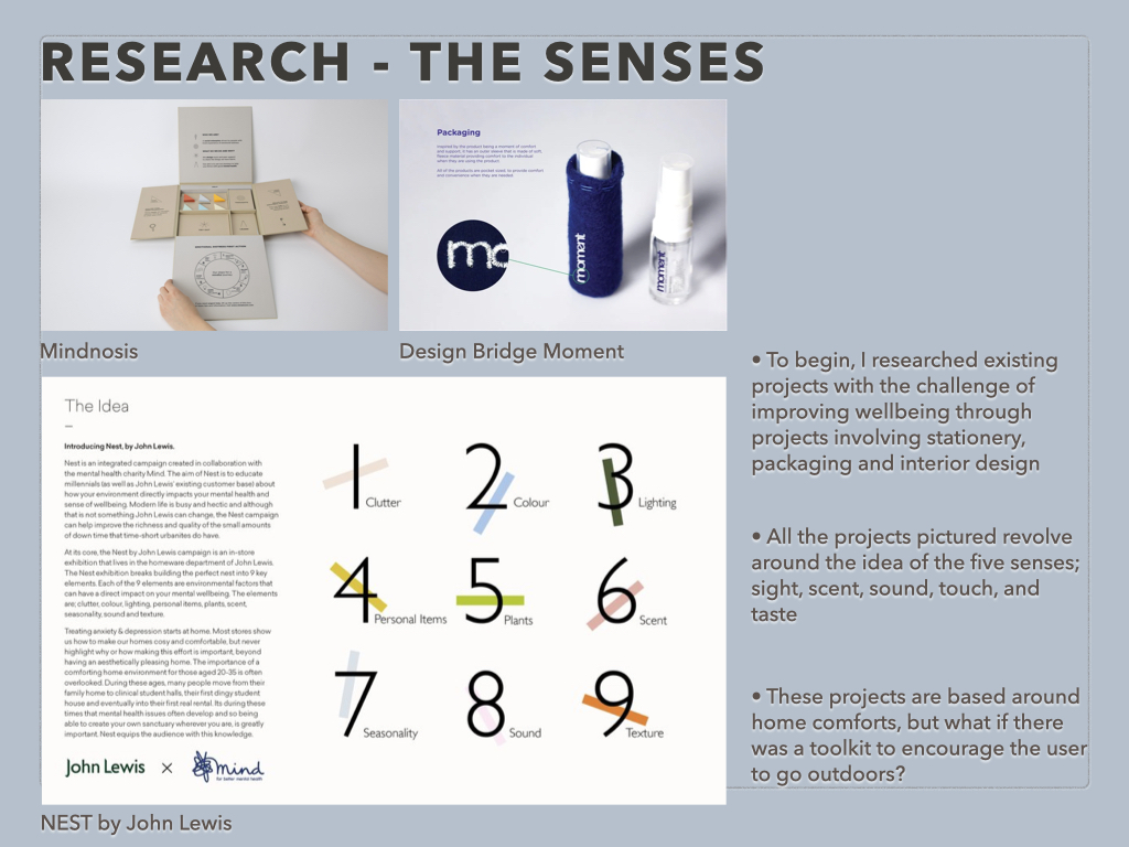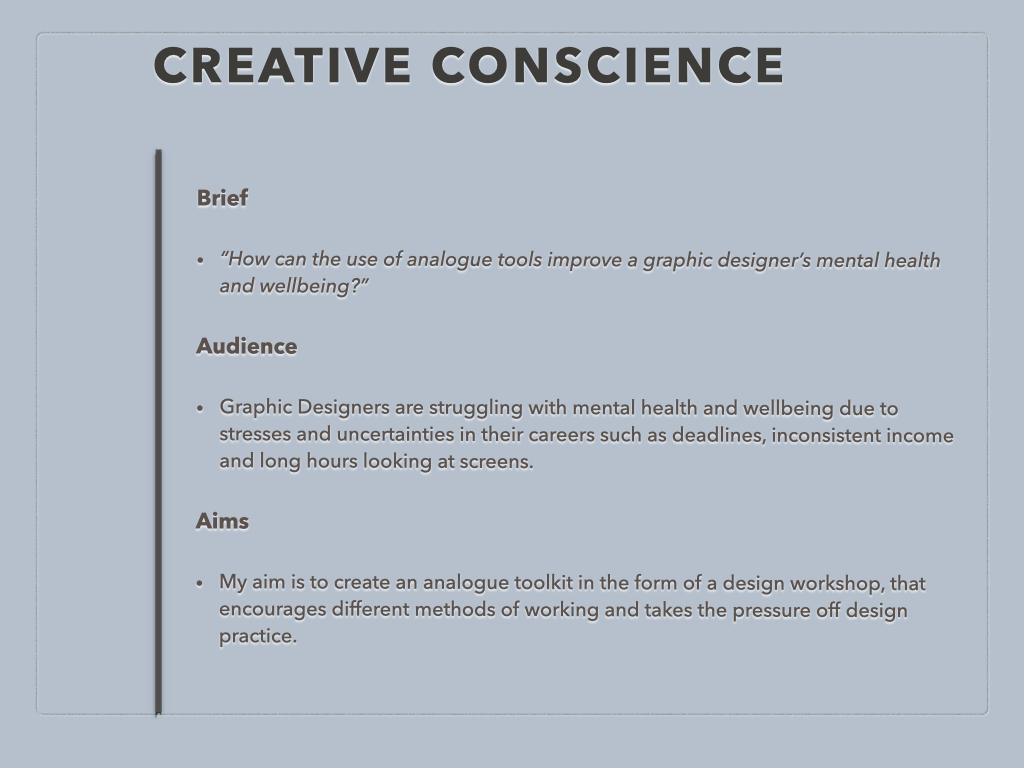 These were my original slides prior to the CRIT. My original research process was looking at how creatives as a whole in the creative industry suffer with mental health; I was thinking about going down a sensory route as this was a prominent theme in my research projects. I ultimately became stuck with further developing my brief as I realised I couldn’t identify my target audience; it was too large. This became a problem when I tried to appeal to many different people through a sensory artefact. I needed to go backwards and revise my audience to solely graphic designers. This was a major turning point!