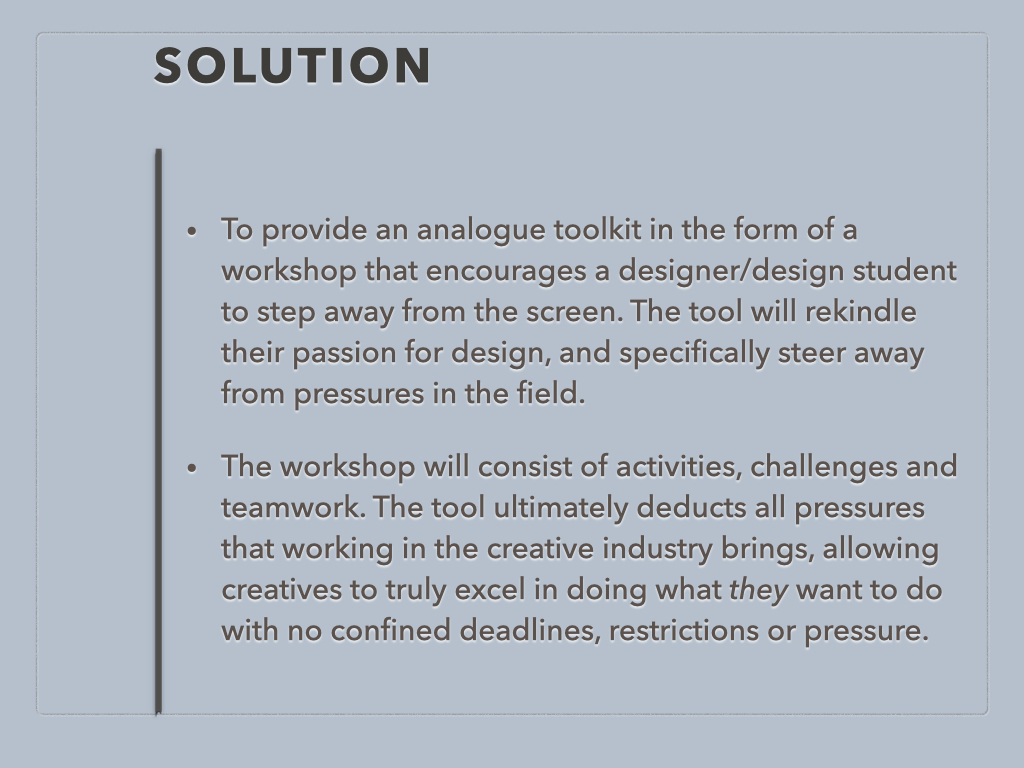 - The solution: a workshop or workshop ‘pack’ to be introduced in the U.K and in design workplaces (SPIN’s experiment journal, typographysummerschool and WeTransfer as inspiration)