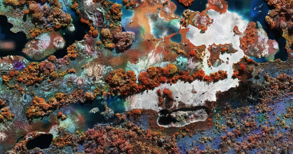 Infrared is invisible to the human eye, and used in his images which look invisible to us. For example, shades of green such as below: