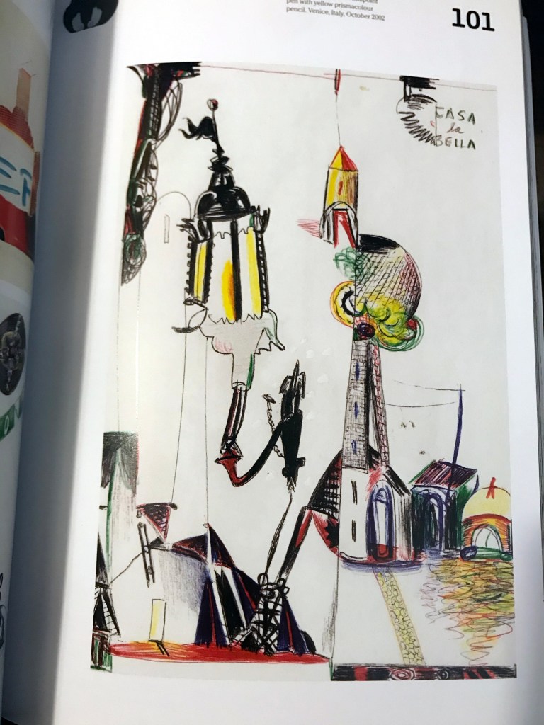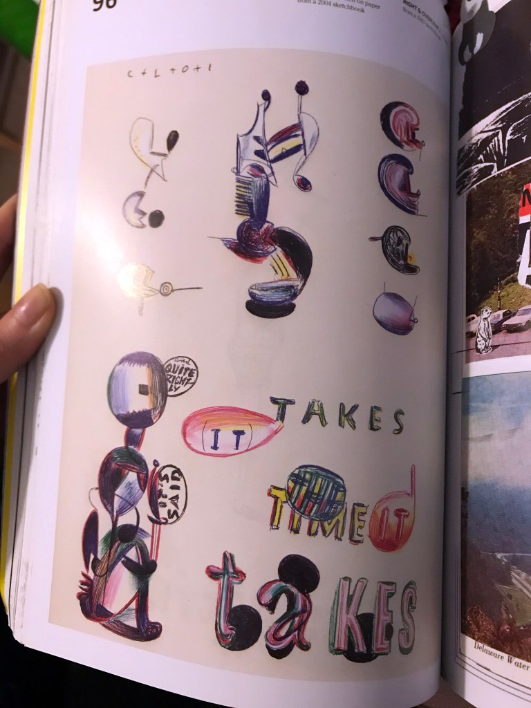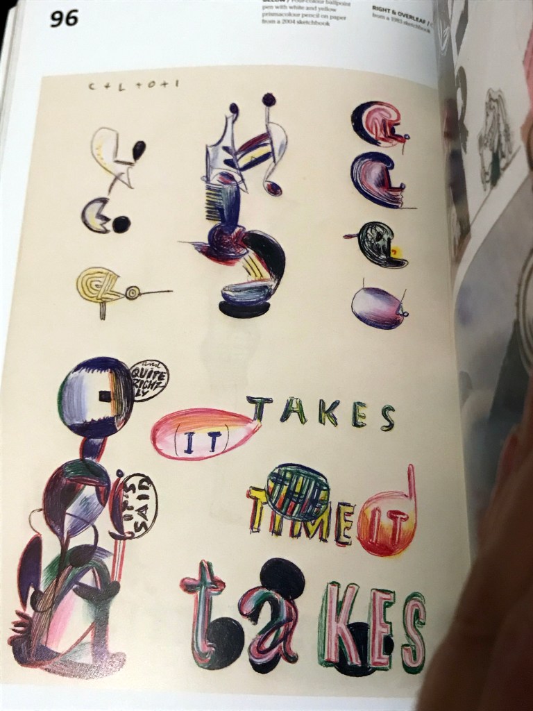 I have scanned in Ed Fella’s snapshots of working sketchbooks as I love the typography and colours. There’s a quote in his bio saying a friend once gave him a sketchbook and said “even though you are a designer, you think like an artist and should keep a sketchbook” – Ed explains he keeps three categories: “pure collage, lettering (in four colour ballpoint with prismacolour pencil), and mixed media form studies and fragments of illustration with some lettering and collage”. I love this idea of having different sketchbooks for different specialisms as I have often felt confused if I have one sketchbook for everything.