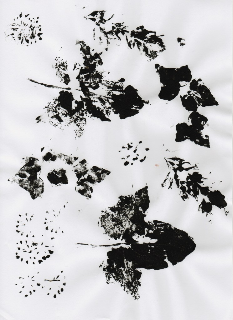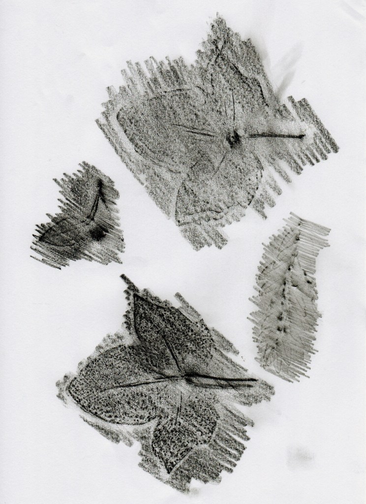 I have taken clippings of the berry bushes and shrubs that were surrounding the area and first made frottage with pencils, then painted them with black acrylic. I wanted to see how much of the detail on leaves would come out: