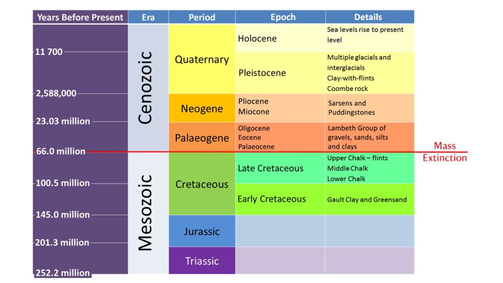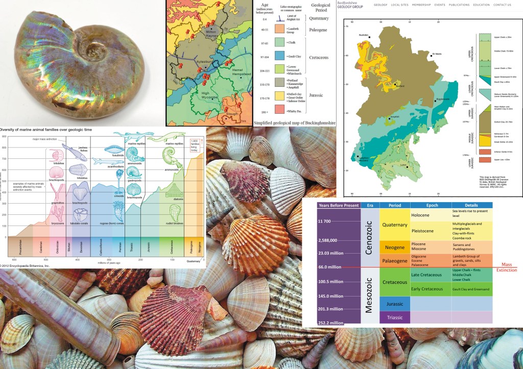 I now want to introduce you to the two main geological time periods (the most significant for fossils) identified within these layers of rocks which you will see in Buckinghamshire today. Fossils discovered have been traced back to their relevant time period as many are now extinct due to the K-pg extinction event – this was the mass extinction of three quarters of the plant and animal species on Earth approximately 66 million years ago (Wikipedia Contributors, 2019). The first is the Jurassic Period, which was approximately 199.6 to 145.5 million years ago and is split into three categories – lower, middle and late Jurassic. The late Jurassic period was a warm, humid climate that hosted lush vegetation and abundant life with many ocean creatures thriving during this time, particularly as the middle Jurassic period had a much cooler climate (Encyclopedia Britannica, n.d.). According to National Geographic (Science, 2017), the oceans were brimming with sea life as the climate temperatures gradually began to rise: ”At the top of the food chain were the long-necked and paddle-finned plesiosaurs, giant marine crocodiles, sharks, and rays. Fishlike ichthyosaurs, squid-like cephalopods, and coil-shelled ammonites were abundant. Coral reefs grew in the warm waters, and sponges, snails, and mollusks flourished”. It’s hard to imagine Milton Keynes being an underwater city, but that’s exactly what it was. The Jurassic period ended with a mass extinction of approximately 76% of marine and terrestrial species on Earth, caused by toxic sulphur volcanic eruptions (MIT News | Massachusetts Institute of Technology, n.d.) Then there was the Cretaceous Period – 145.5 to 65.5 million years ago is the period that ended and wiped out all dinosaurs to extinction as we know it, due to a 7.5 mile wide asteroid hitting the Earth at 45,000 miles an hour (Greshko, 2019). Interestingly, this devastation didn’t seem to impact sea creatures that we know existed in the Jurassic period and many creatures survived, however it did wipe out approximately 80% and one of the species were the ammonites (The Editors of Encyclopedia Britannica, 2019) which is how we know that they date back from this period of time.