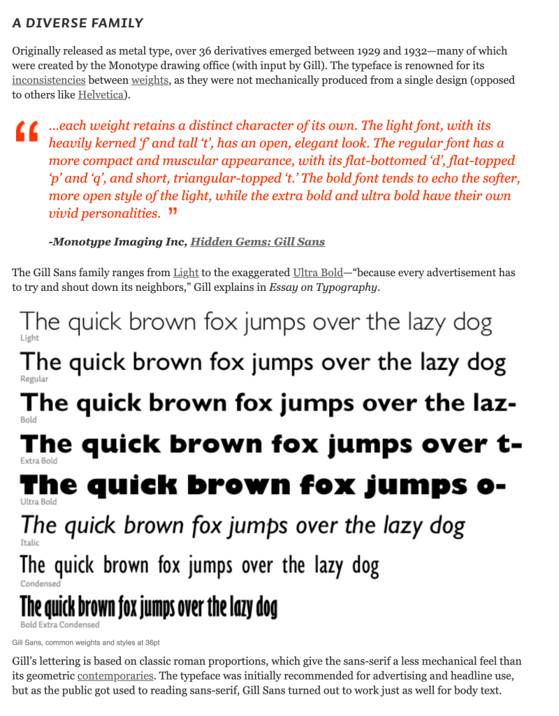 Gill Sans is an interesting choice of typeface for this project, and I wanted to learn more about why this typeface was used for the project so I did some research:
