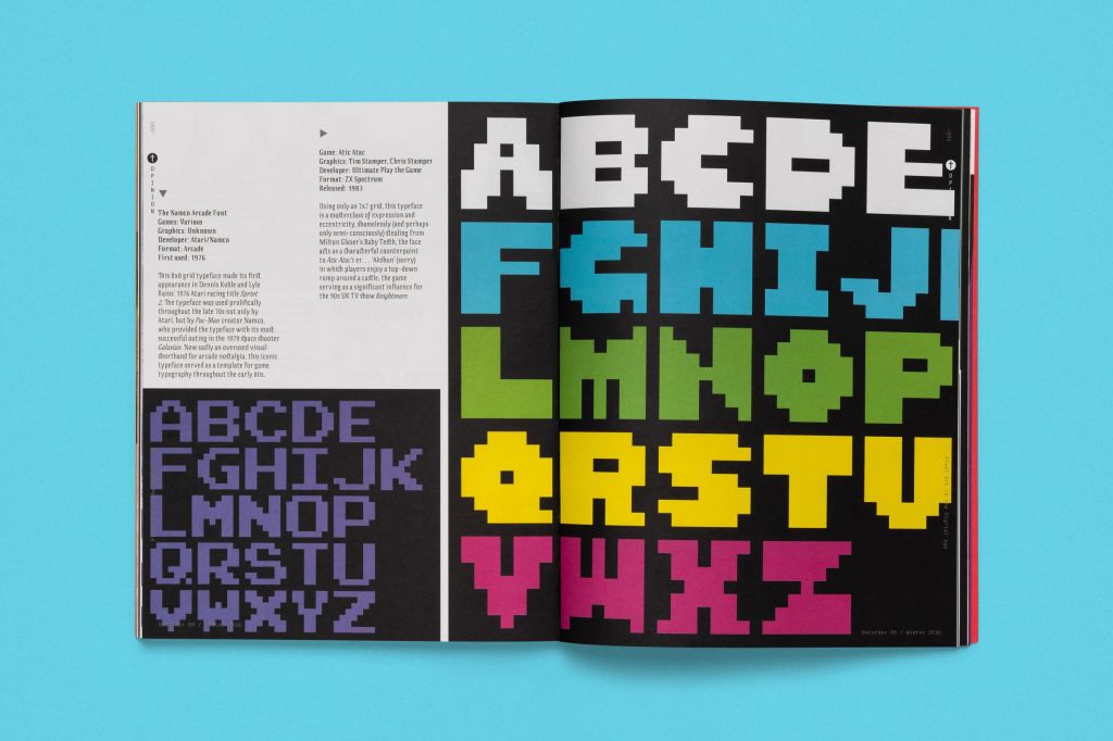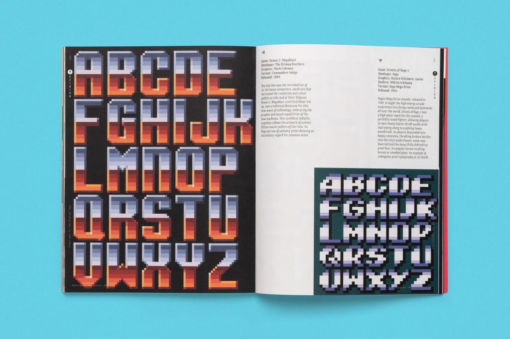 “An 8-page, tongue in cheek research feature for Monotype’s Recorder magazine on early videogame typography. I present ten examples of the form, a practice that was often constrained to grids of just 8×8 pixels, and examine the unique characteristics of this often neglected area of type design. My selections span cult titles such as Atic Atac and Xenon 2: Megablast, to global smash hits Street Fighter II and Doom.” – Source