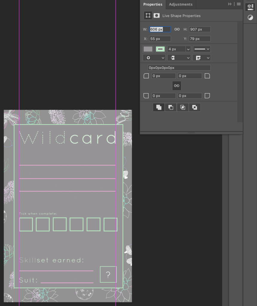 Experiments showing how I came to choose the lines that I could write on for my wildcards – I made the opacity at 45% in the end as I wanted to have the lines as guides. I can write my future challenge on these cards to acquire more skills.