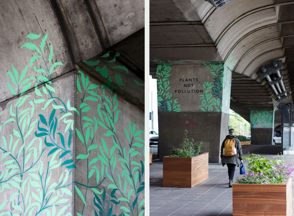 “Hammersmith & Fulham Borough Council asked us to paint the Hammersmith Flyover in support of a project that has improved the space and the air quality under the flyover. Planters have been introduced along with an Ivy barricade that reduces the impact of harmful emissions entering the pedestrian space. We asked; how might we celebrate plants and their positive impact on place and pollution? Our approach takes inspiration from Hammersmith’s notable past residents William Morris and typographer Edward Johnston.”