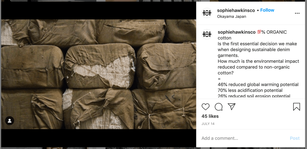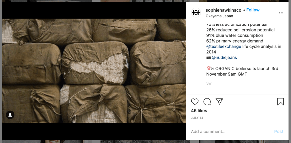 Going back to the lecture – Sophie has had to source her fabric from Japan and not locally which is obviously a downfall compared with her sustainably locally sourced competitors. From looking at her instagram I can see Sophie does the dying of the fabric herself so there is an element of manual labour already – why not take that extra step further into seeing how to resource materials locally or make them herself?