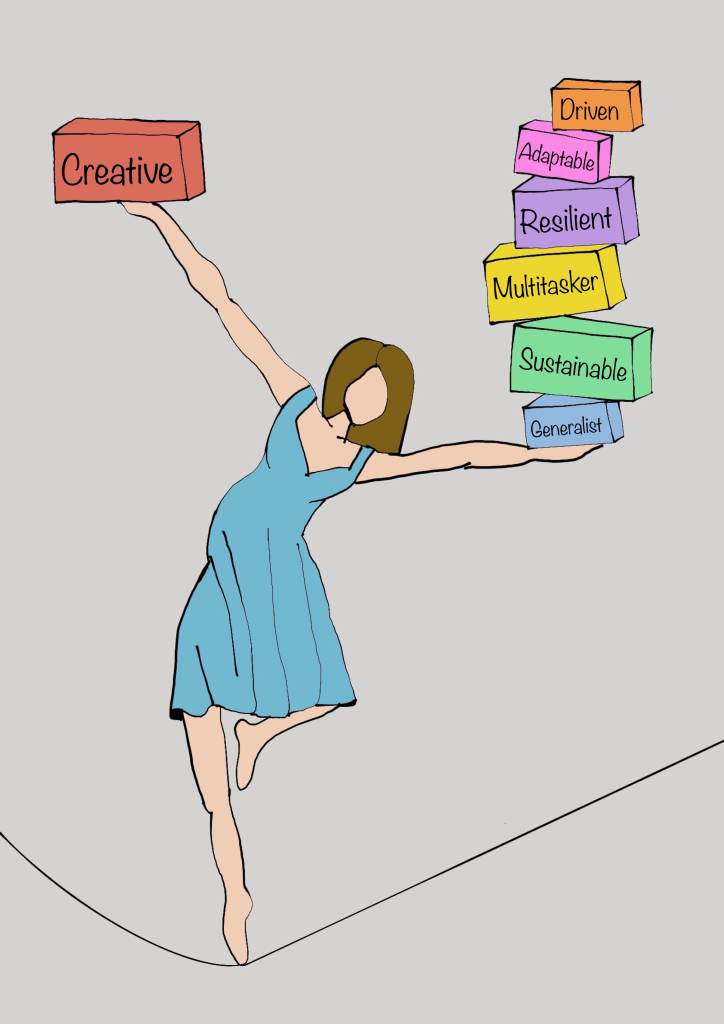 I liked the idea of having the skill and talent to be able to balance all of these skills at once, so presented the design entrepreneur as myself, walking on a tightrope.
