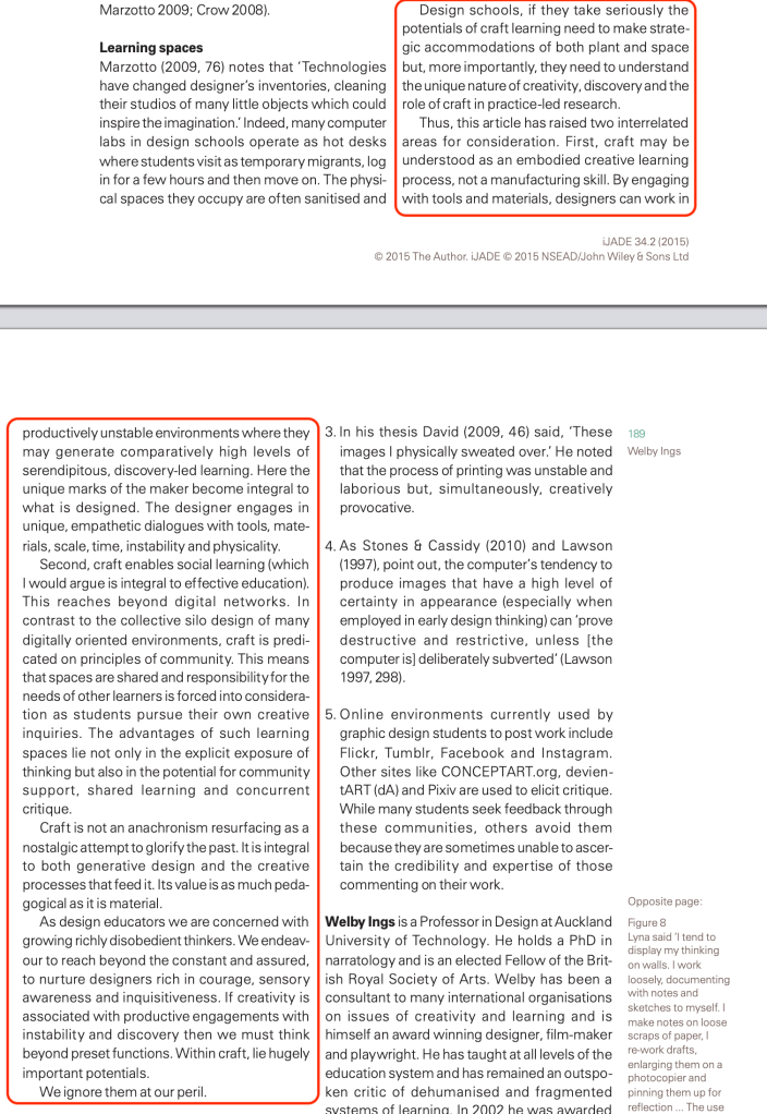 I have discovered an article “Malleable Thought: The Role of Craft Thinking in Practice-Led Graphic Design” – Welby Ings which has been a thoroughly interested read. In relation to my research it is evident that craft had fallen ‘out’ of creative roles since the introduction of computers in the 90’s and instead, computers are actually considered a craft. These two screenshots are areas of text I found informative:
