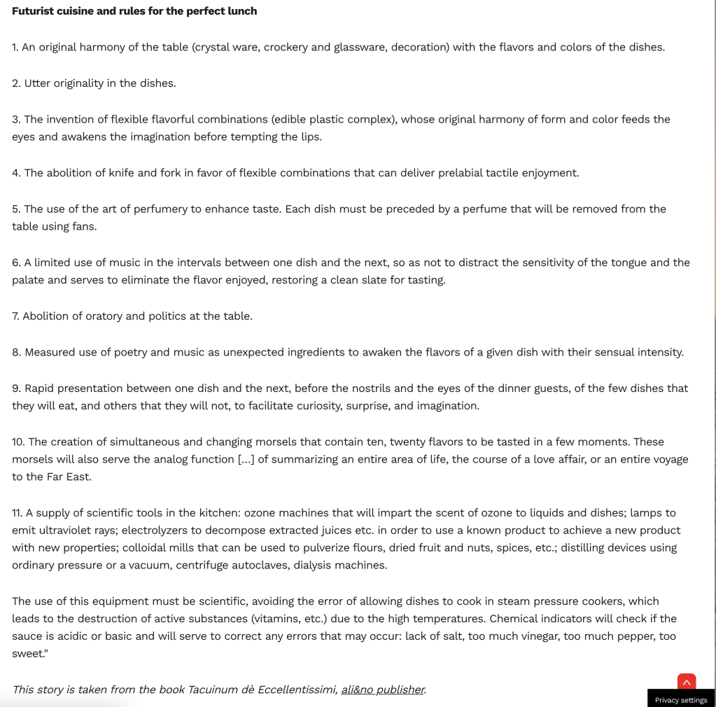 On further investigation of the Futurist movement, they believed that not eating with utensils ruined the dining experience. Additionally, wanted to ban pasta as it was not actually native to Italy and imported. In fear of a sudden war – pasta would not be locally available and therefore they wanted to abolish it. Instead, they pledged rice would be far more suitable for Italy’s dishes; along with encouraging a unique ‘experience’ of dining by playing music and spraying perfumes. (Image also from linked source below)