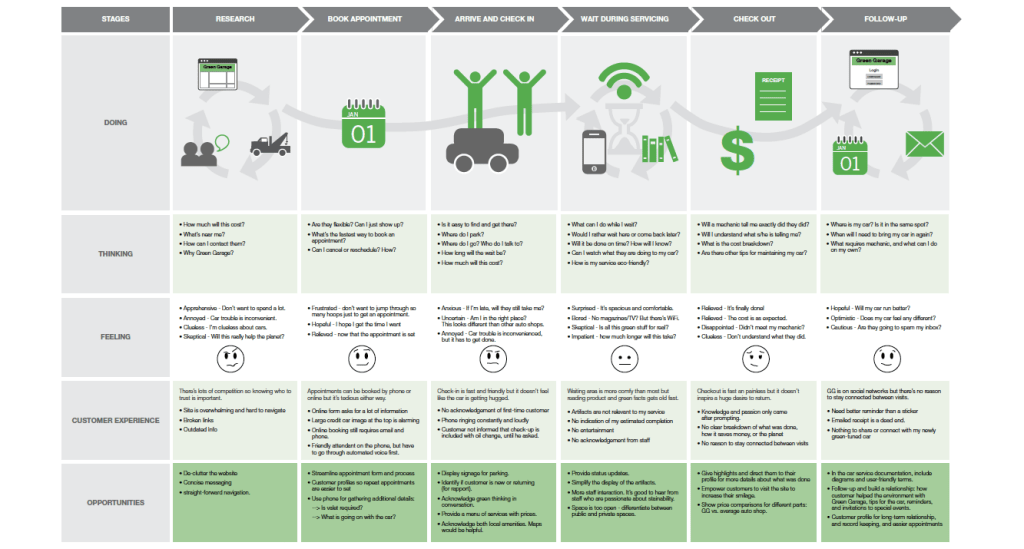 This example highlights the ‘mood’ by using emoji’s which quickly identifies which areas in the user journey will require assistance or needs room for improvement.