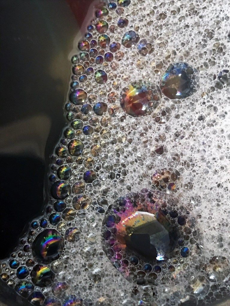 This made me think of where sponges are used. In my case, bathing and washing up. So then that lead to bubbles. There is a fascinating formation of iridescence on bubbles (which I’ve always loved!) and I decided to take some of my own pictures (see below):